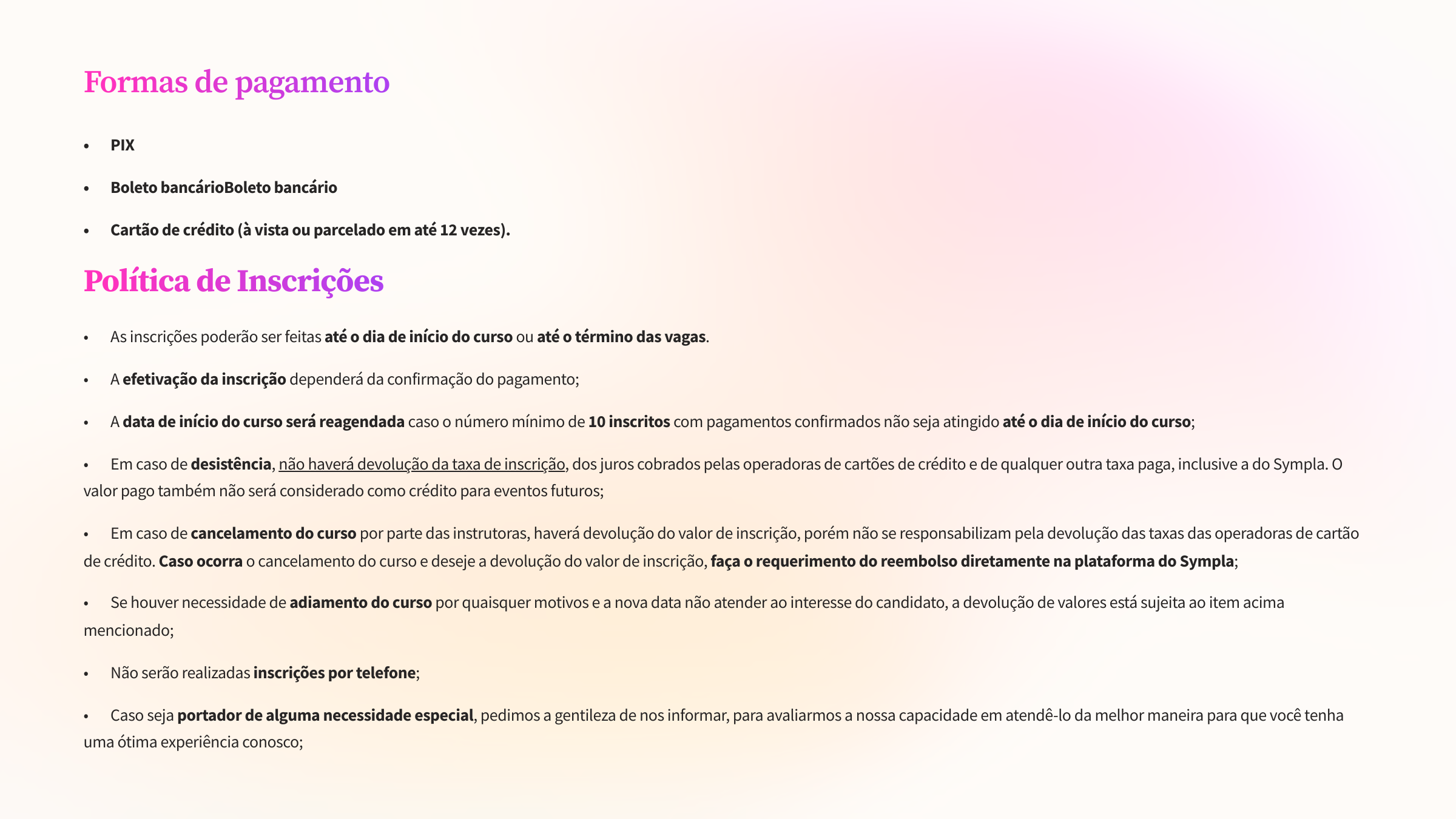 Cancelamentos de pedidos serão aceitos até 7 dias após a compra, desde que a solicitação seja enviada até 48 horas antes do início do evento.