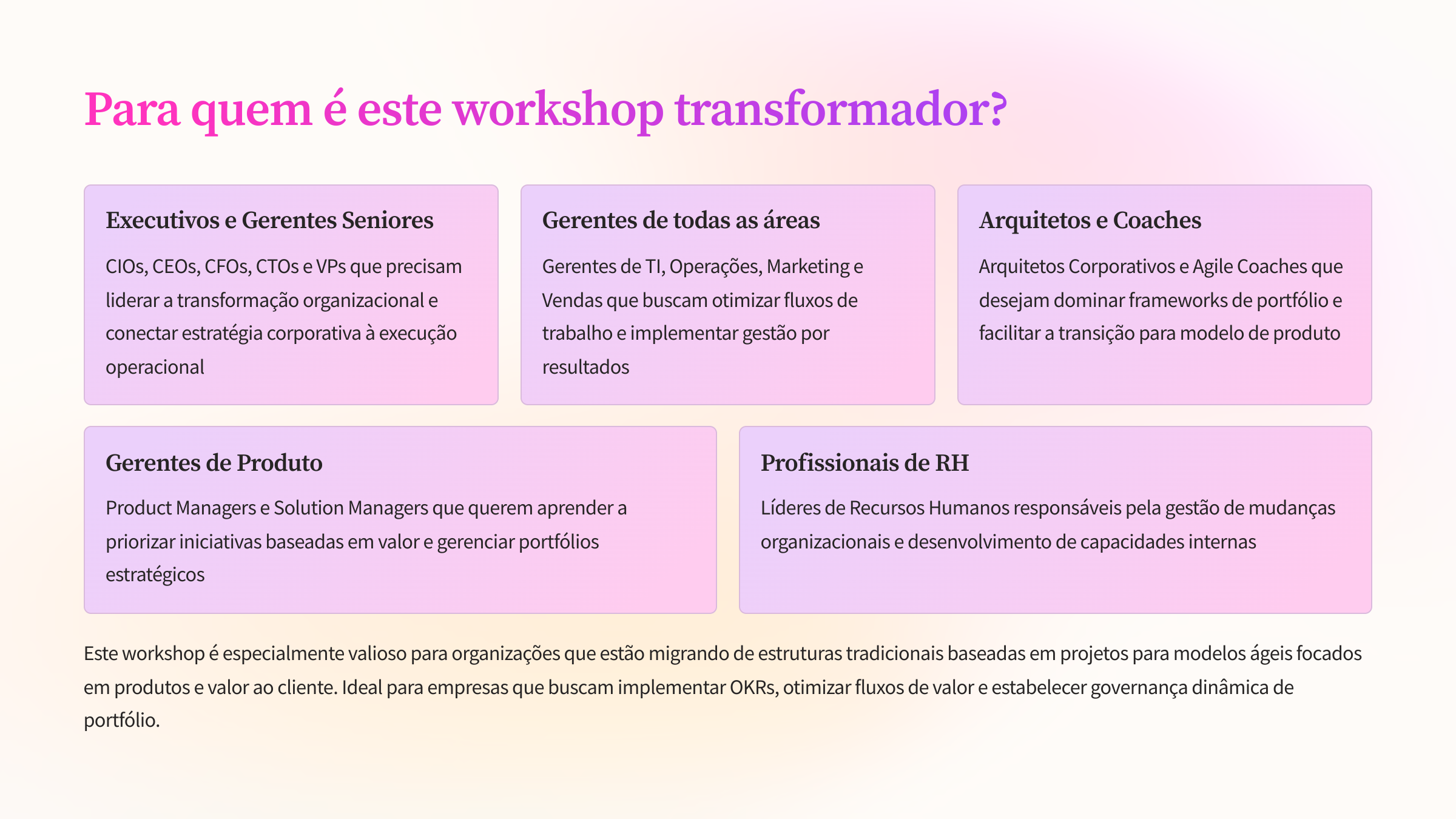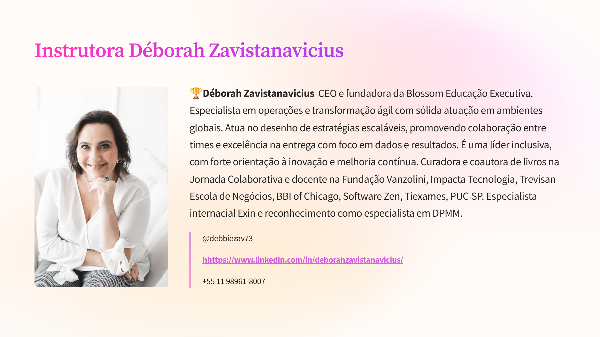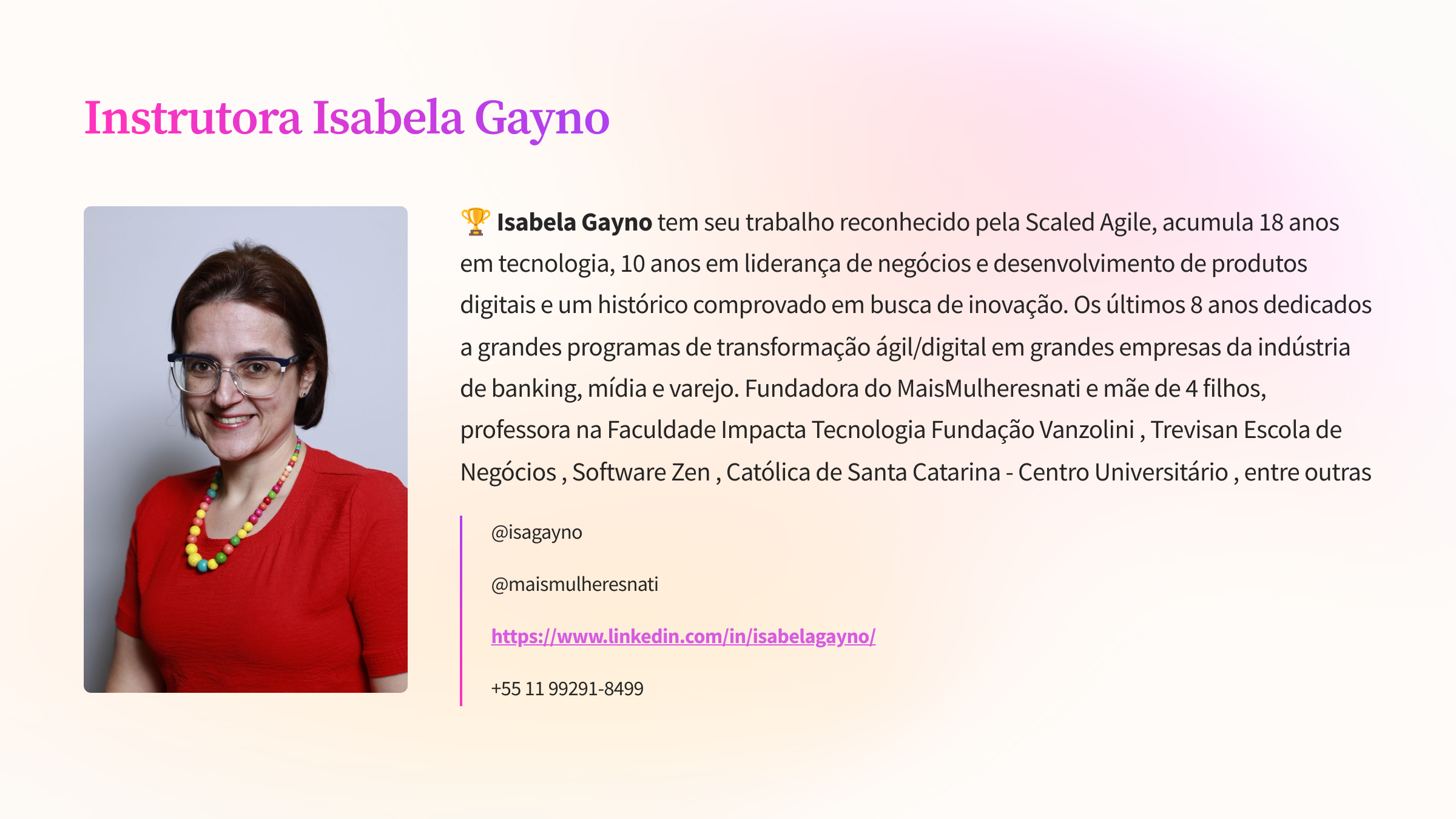 Isabela Gayno, Com o trabalho reconhecido pela Scaled Agile, é trainer oficial da Scaled Agile e acumula 20 anos de experiência em Desenvolvimento Ágil de Software, treinou mais de 400 pessoas, atua do Gerenciamento de Produtos à Gerenciamento de Portfólio e nos últimos 7 anos atuou em programas de transformação lean ágil em grandes empresas da indústria de mídia, varejo e banking.