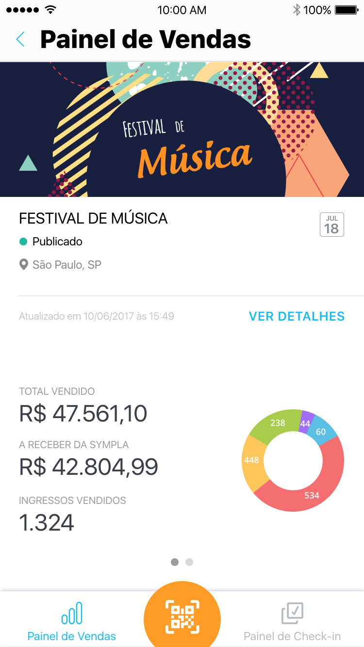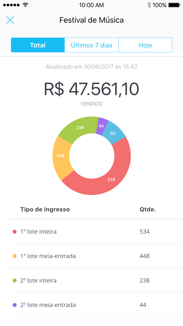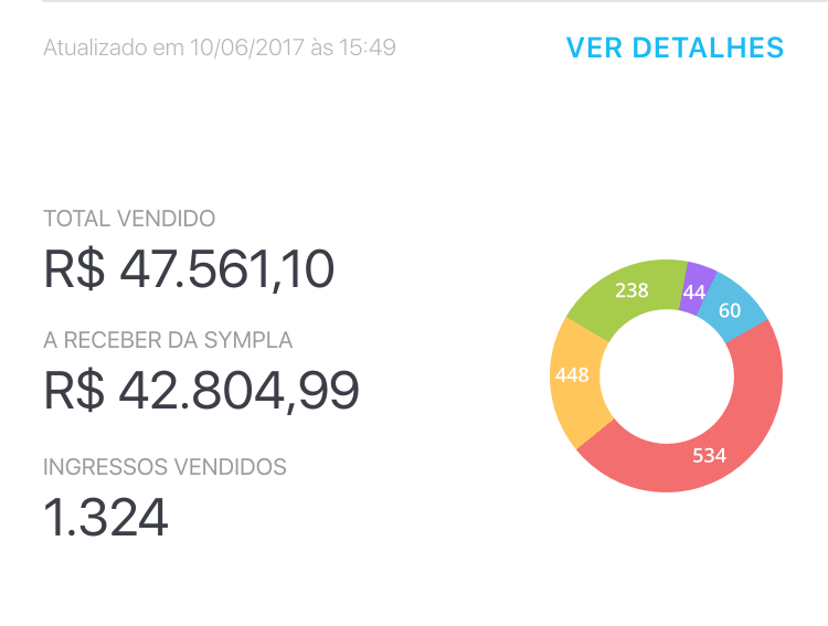 Visualize a quantidade e os detalhes de cada tipo de ingresso ou inscrição vendida através de gráficos