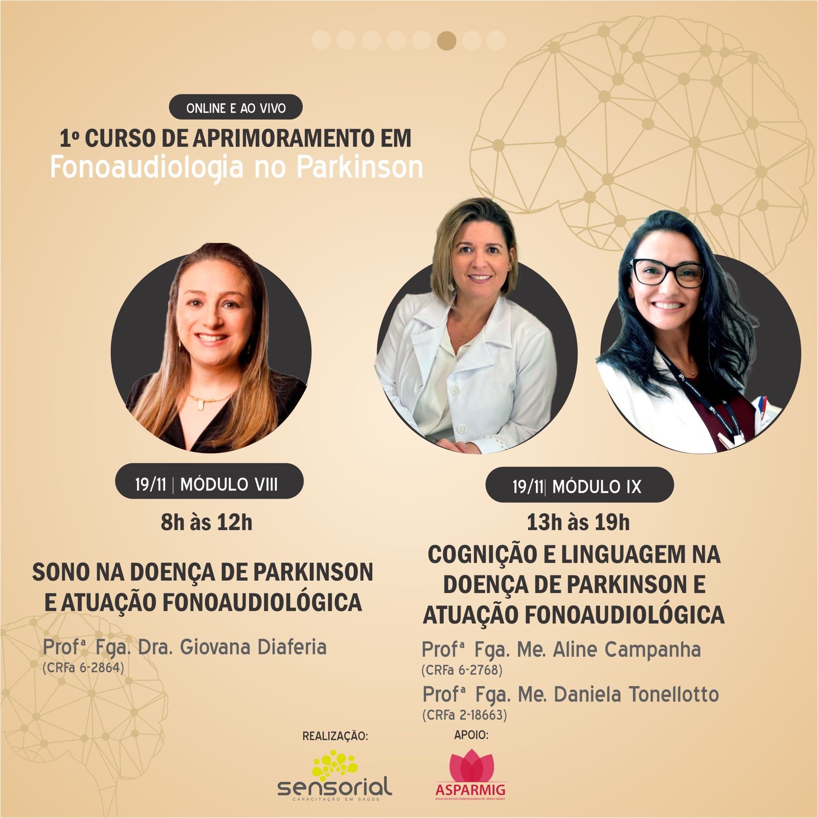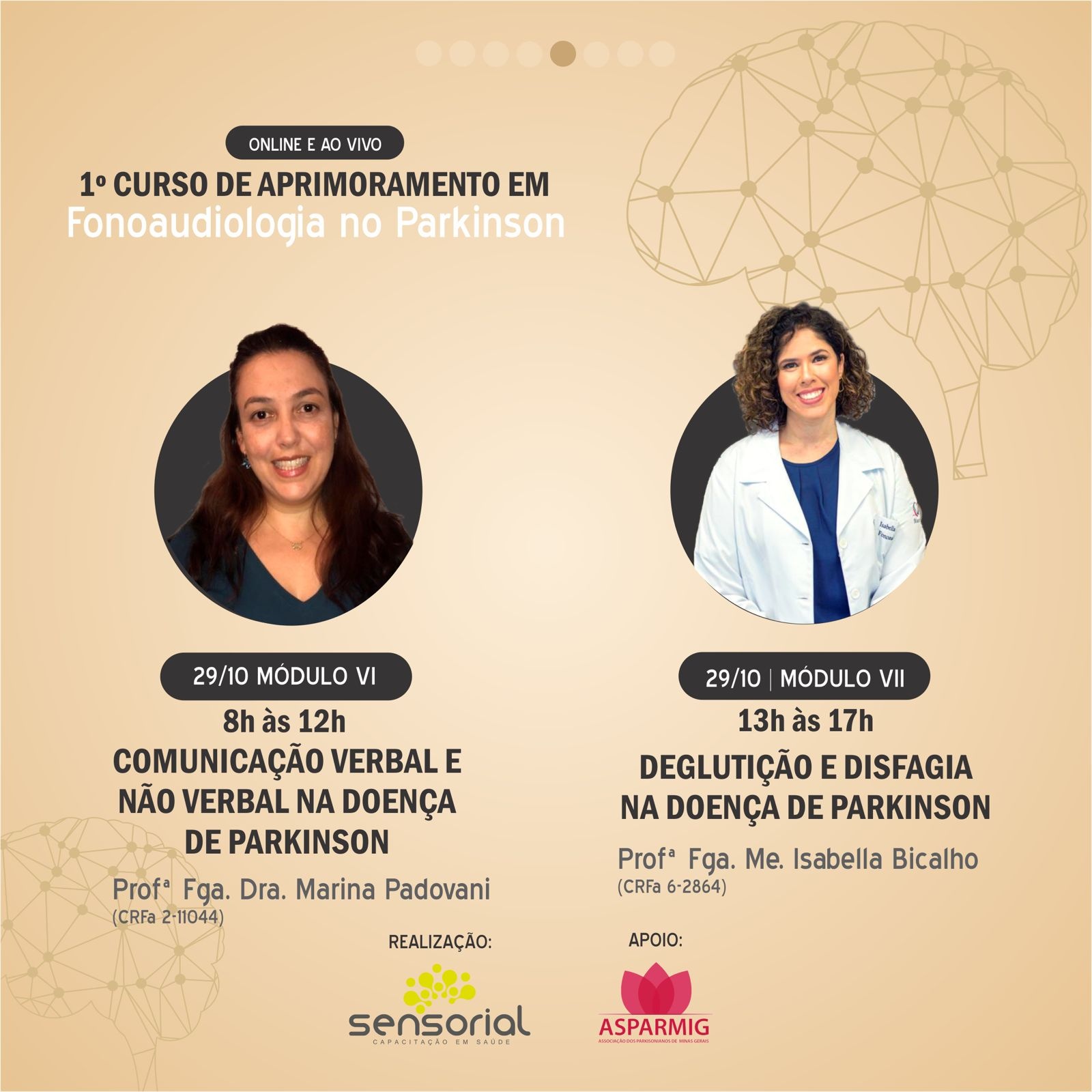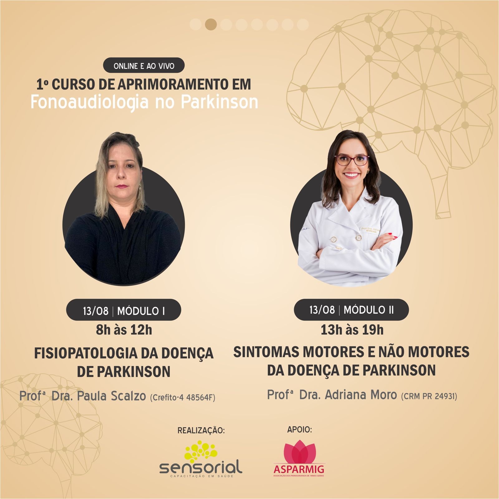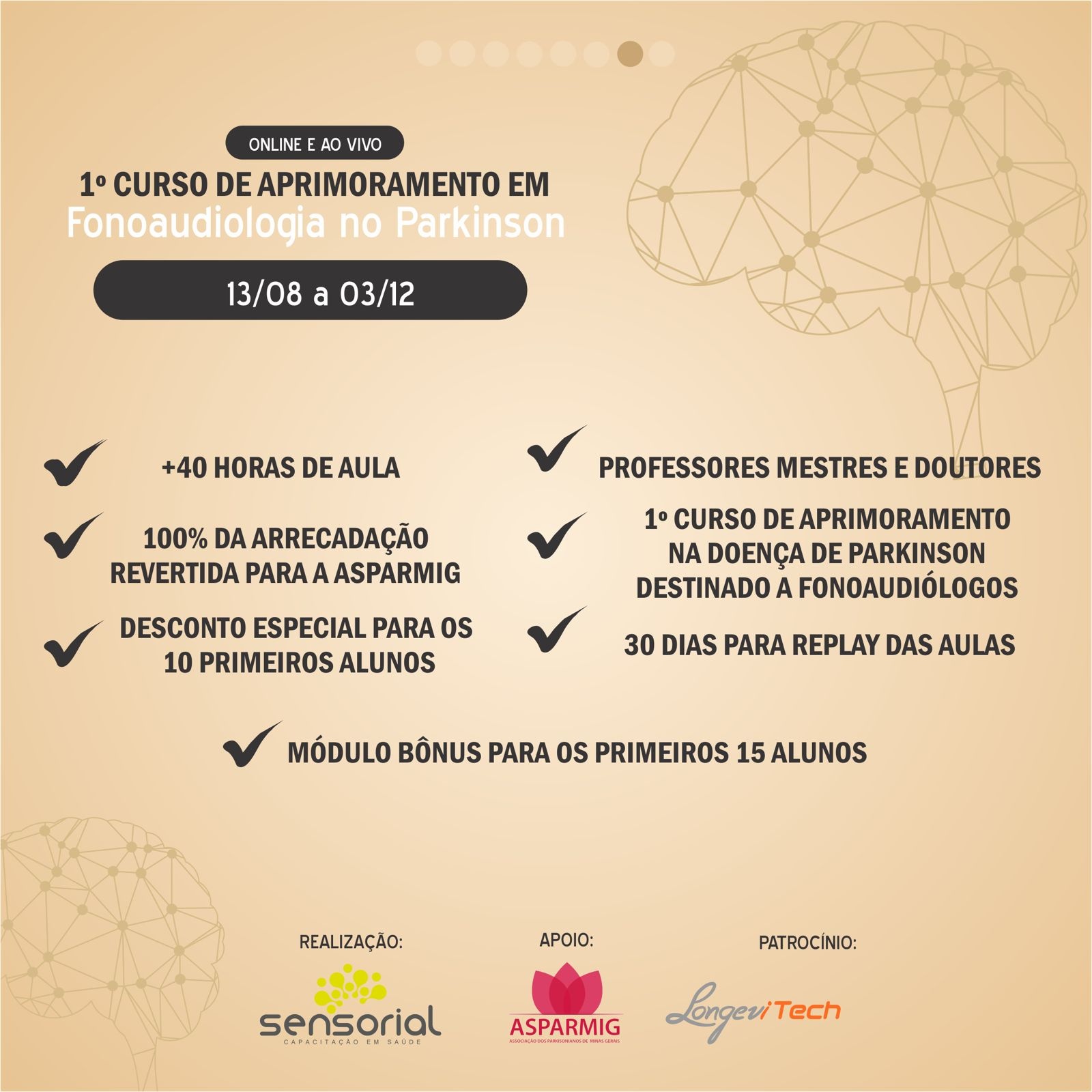 A Sensorial, com o apoio da ASPARMIG, promoverá online/ao vivo, o "1º Curso de Aprimoramento em Fonoaudiologia no Parkinson" com o objetivo de atualizar, aprofundar os conhecimentos e promover uma formação complementar e humanizada para o fonoaudiólogo que atende pessoas com Parkinson. Este curso também tem objetivo social e visa ajudar a Associação a manter as suas atividades e por isso, toda a renda será destinada como doação à ASPARMIG.