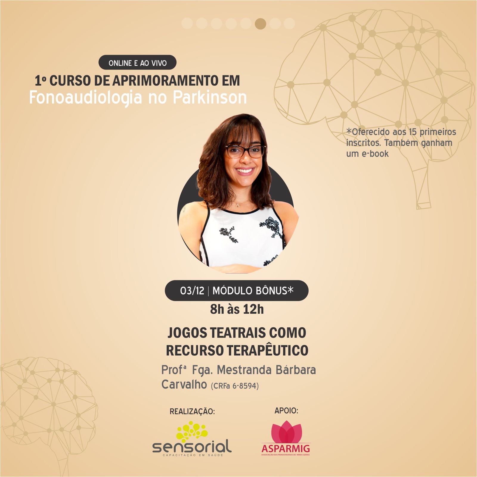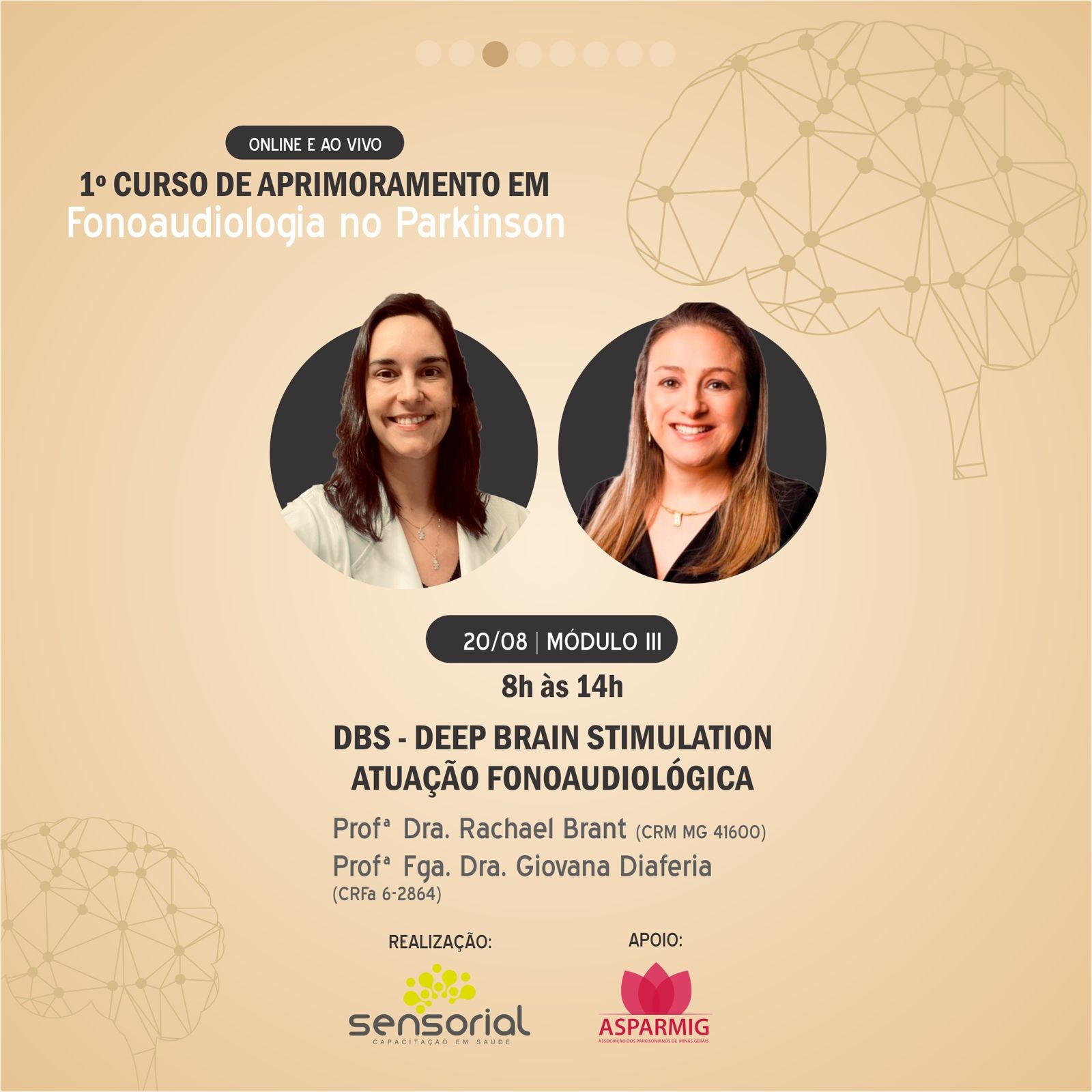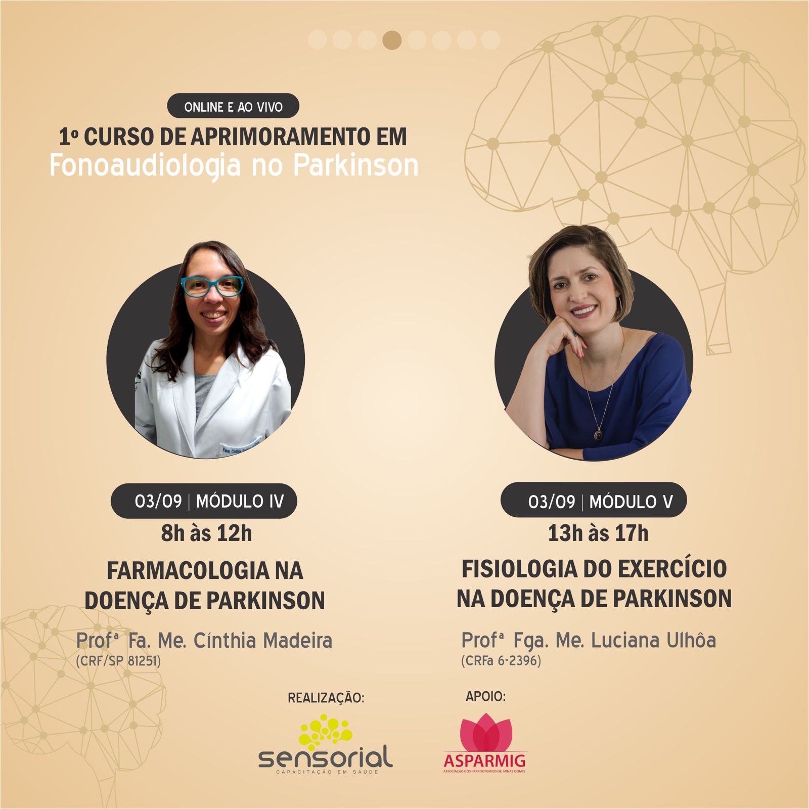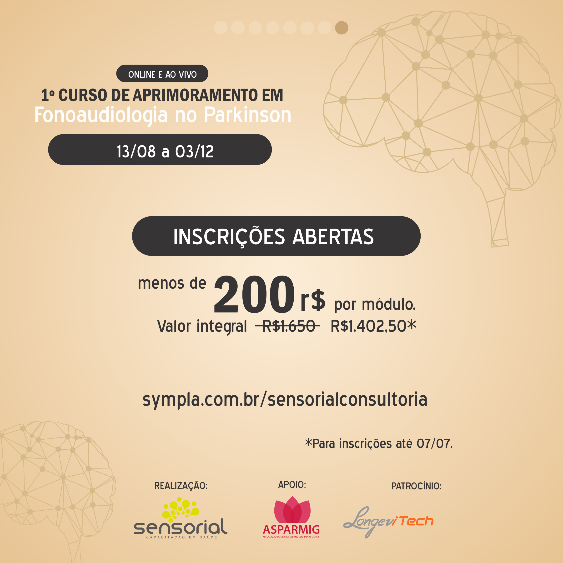 A Sensorial, com o apoio da ASPARMIG, promoverá online/ao vivo, o "1º Curso de Aprimoramento em Fonoaudiologia no Parkinson" com o objetivo de atualizar, aprofundar os conhecimentos e promover uma formação complementar e humanizada para o fonoaudiólogo que atende pessoas com Parkinson. Este curso também tem objetivo social e visa ajudar a Associação a manter as suas atividades e por isso, toda a renda será destinada como doação à ASPARMIG.