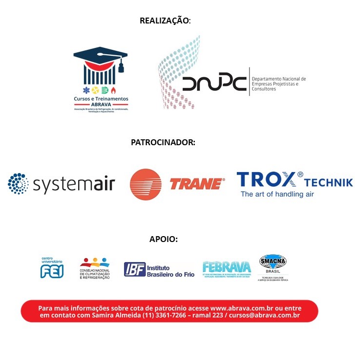 Pré-requisito para o candidato: Conhecimento para interpretação de desenho técnico. O participante deverá ter notebook, tablet ou smartphone que permite carregar planilha Excel para dimensionamento de dutos. Não serão ministradas aulas de desenho técnico de sistemas de ar condicionado, AutoCAD e cálculo de carga térmica.