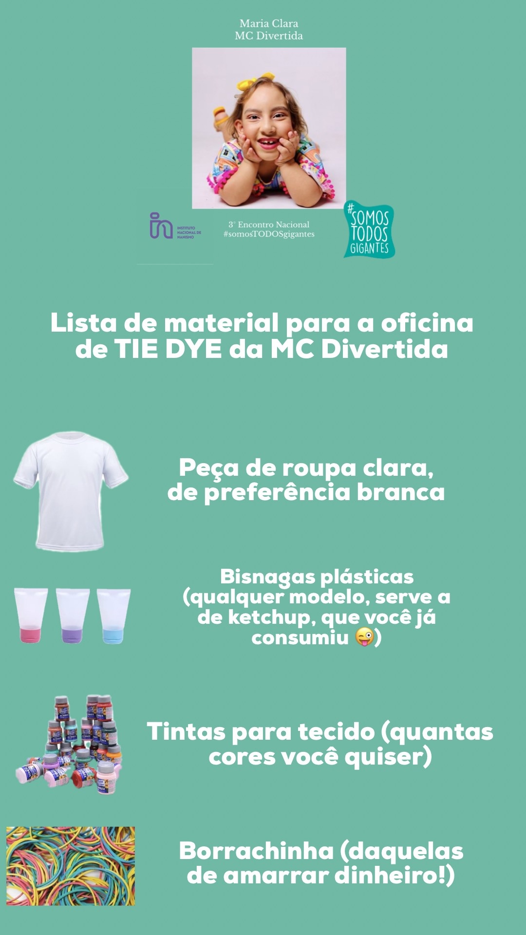 15:30h: Tempo de Criança com MC Divertida (Oficina de Tye Dye) - Providenciar materiais da lista abaixo.