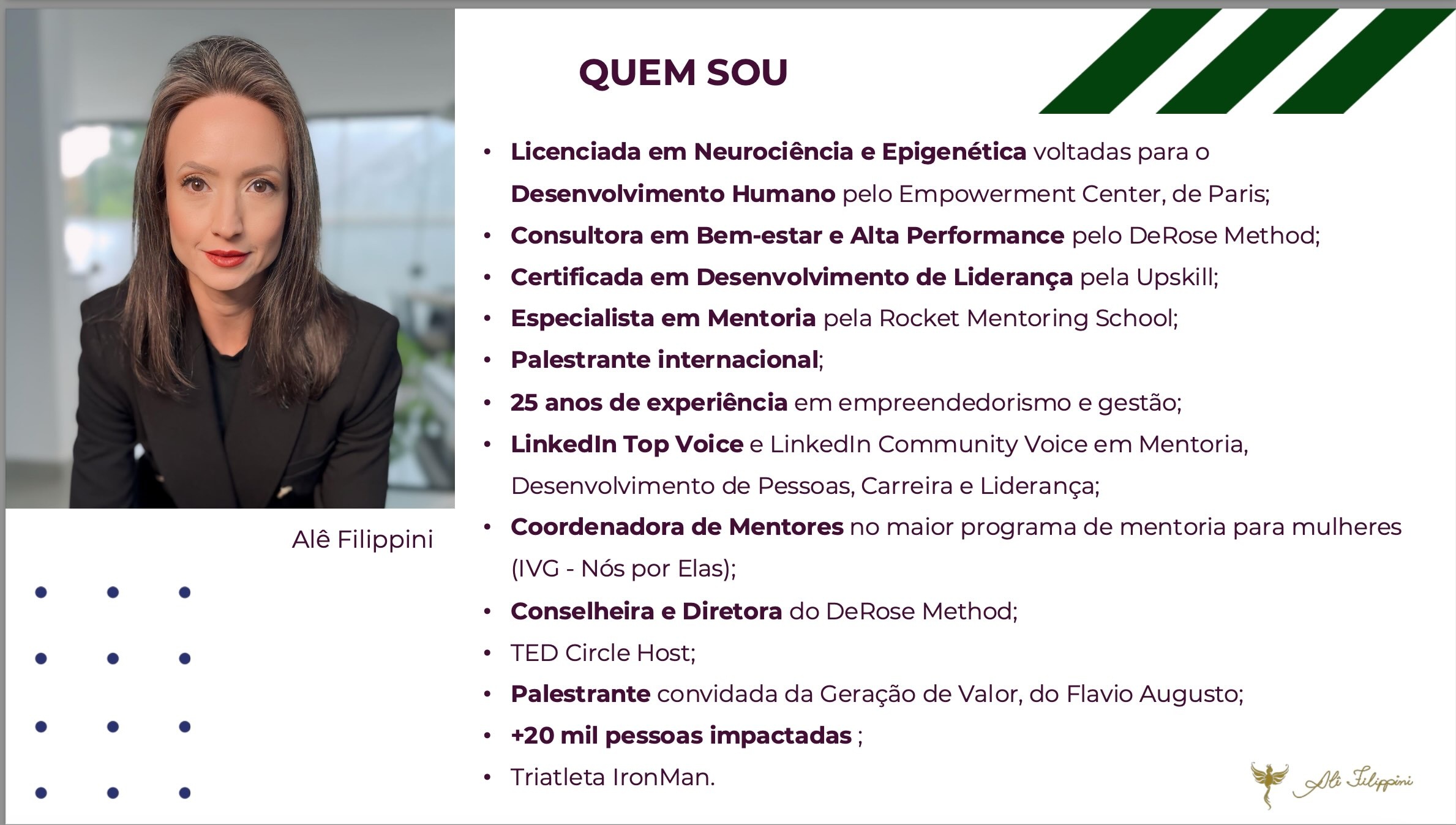 Alê Filippini é apaixonada por desenvolver pessoas. Mentora, palestrante internacional, CEO do DeROSE Method Alphaville, com mais de 15 anos de experiência e mais de 20 mil pessoas impactadas. Eleita pela maior plataforma de relacionamento profissional do mundo - LinkedIn - como uma das maiores autoridades em Carreira e Saúde no Brasil (LinkedIn Top Voice).