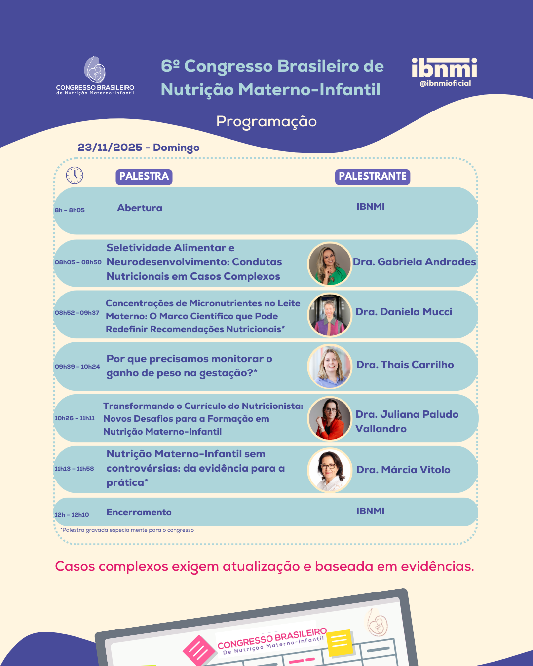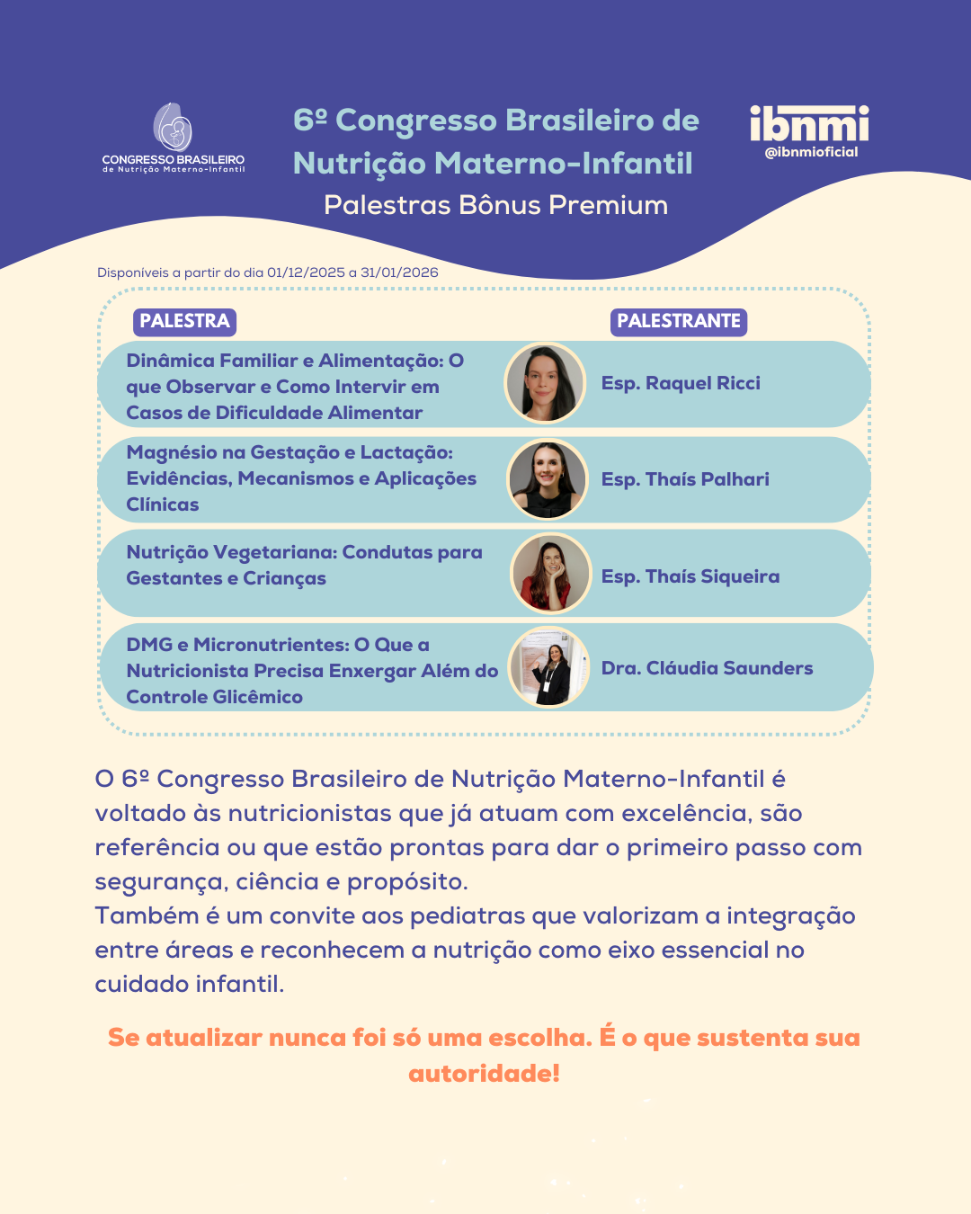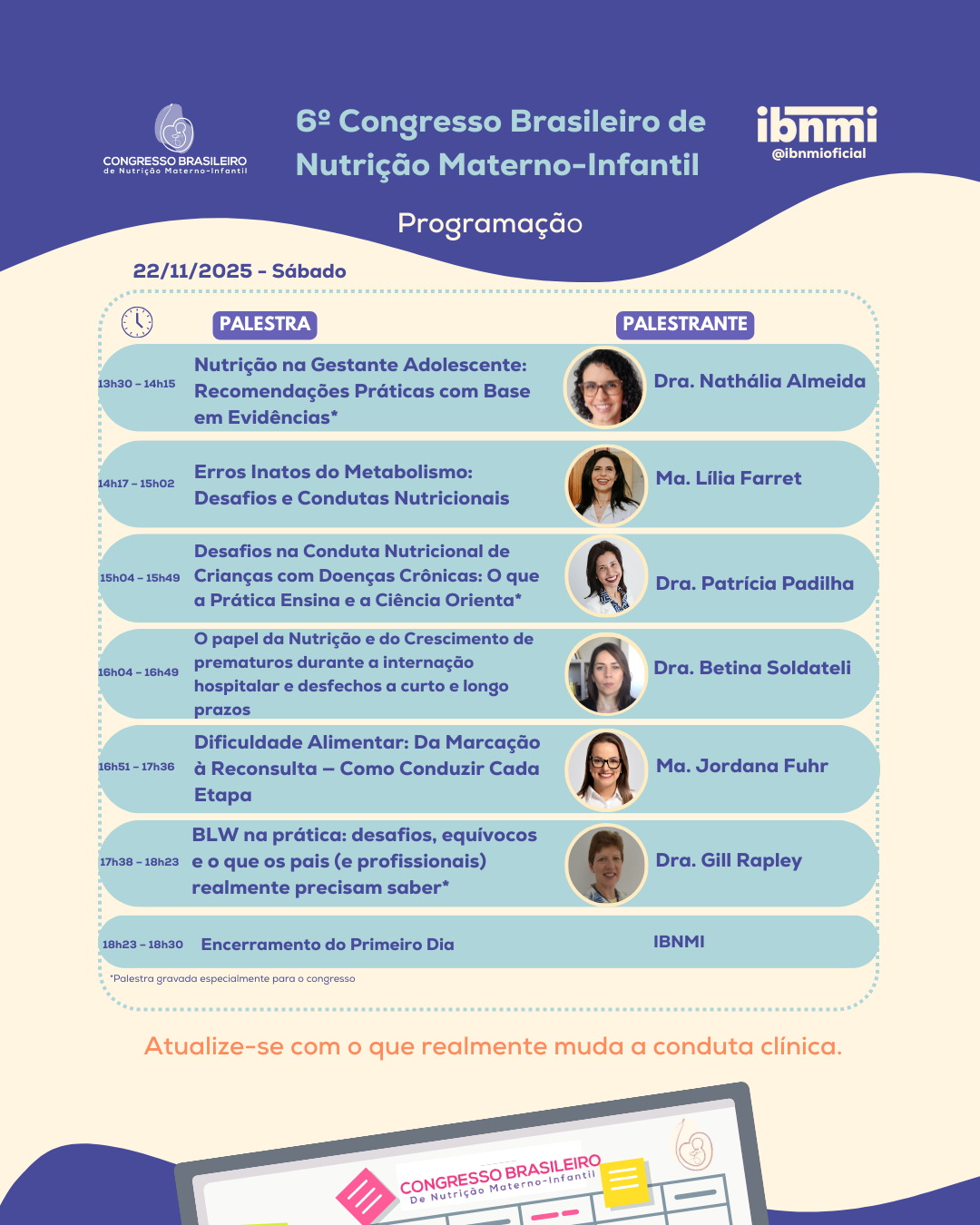 Esta é uma oportunidade única de se atualizar com profissionais reconhecidos por sua expertise e contribuição técnica, em um encontro que reúne o que há de mais relevante para a prática clínica e a pesquisa em nutrição materno-infantil.