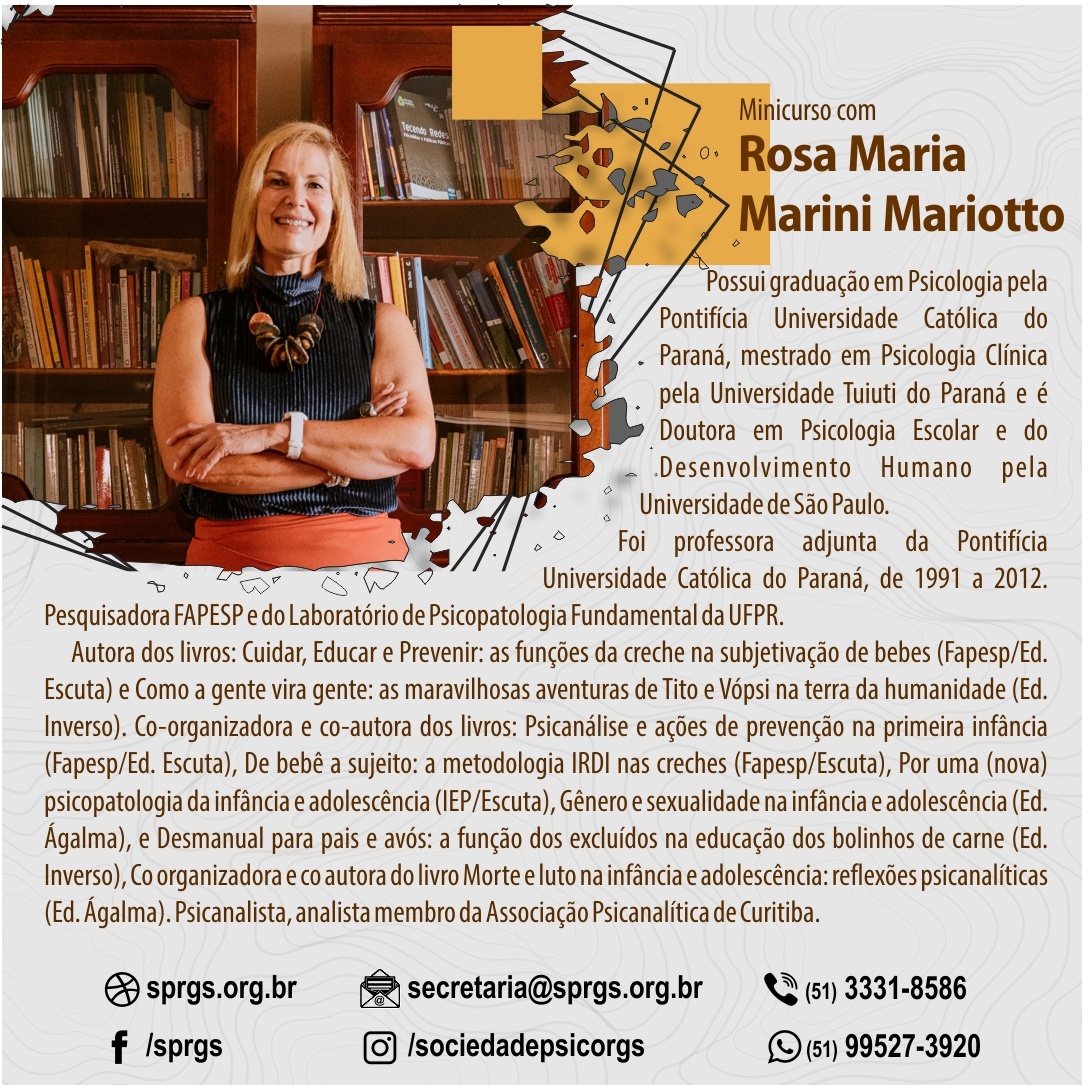 Rosa Maria Marini Mariotto: Psicóloga (PUCPR). Mestre em Psicologia Clínica (Universidade Tuiuti do Paraná), Doutora em Psicologia Escolar e do Desenvolvimento Humano (Universidade de São Paulo).