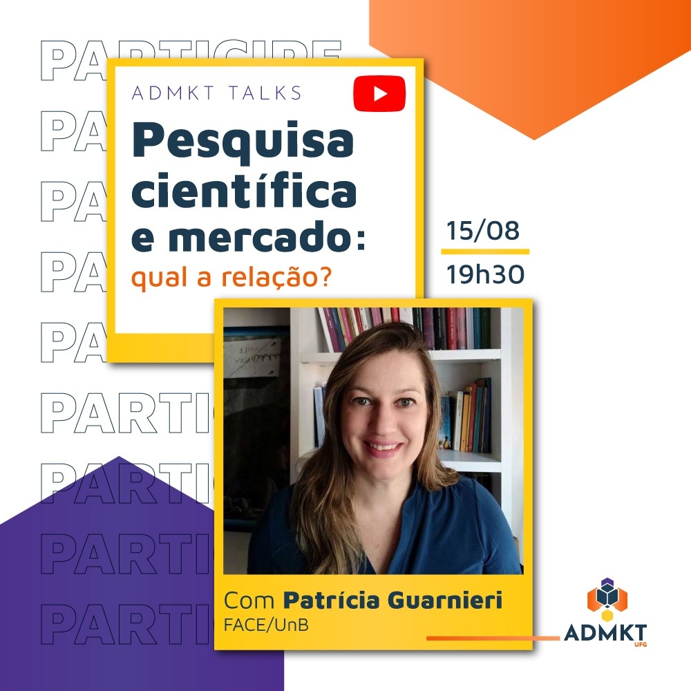 No dia 15 de agosto (segunda) às 19h30min apresentaremos a palestra “Pesquisa Científica e Mercado: Qual a Relação?” com Patrícia Guarnieri.
