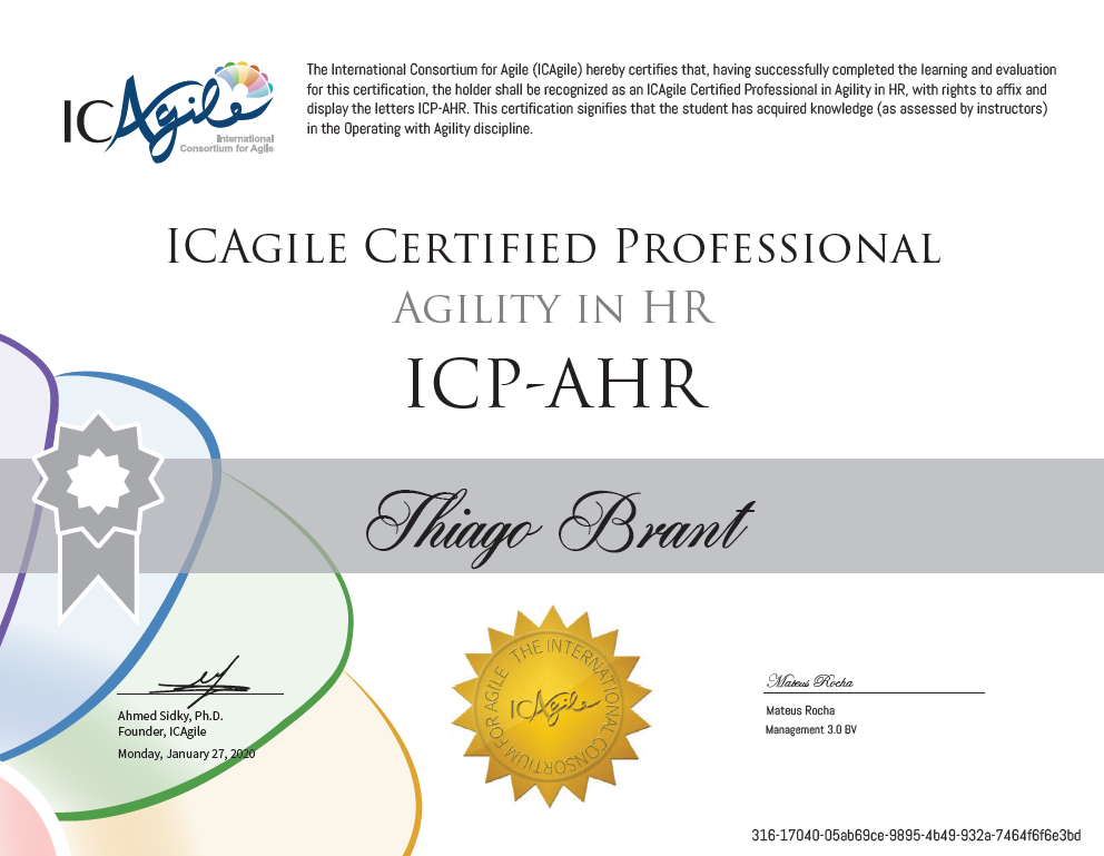 Certificado: Este Workshop oferece duas Certificações Internacionais, um pelo Management 3.0 e outro pela ICAgile: