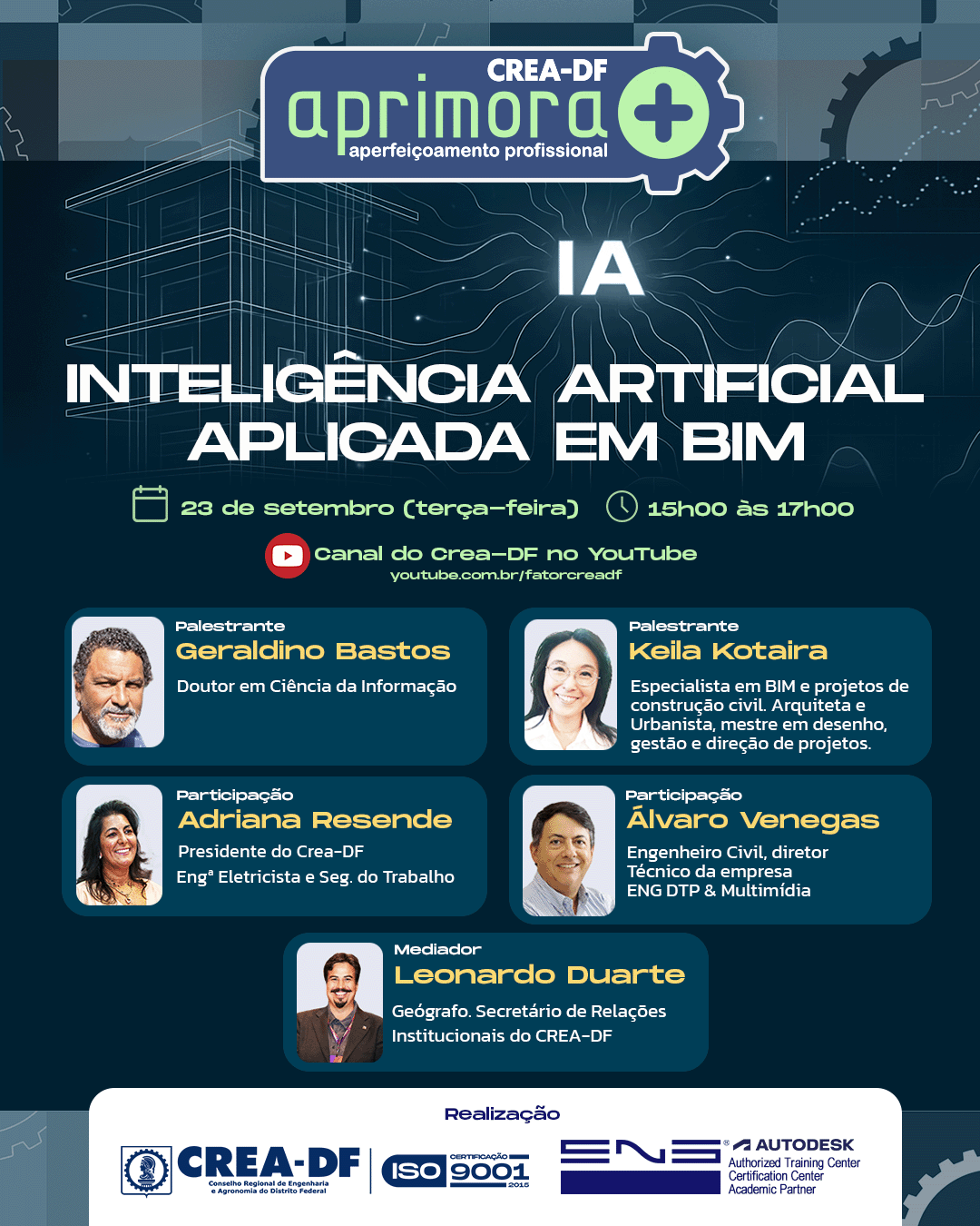 O evento contará com a participação do Dr. em Ciência da Informação Geraldino Bastos, da especialista em BIM e projetos de construção civil Keila Kotaira, do engenheiro civil e diretor técnico da ENG DTP & Multimídia Álvaro Venegas.