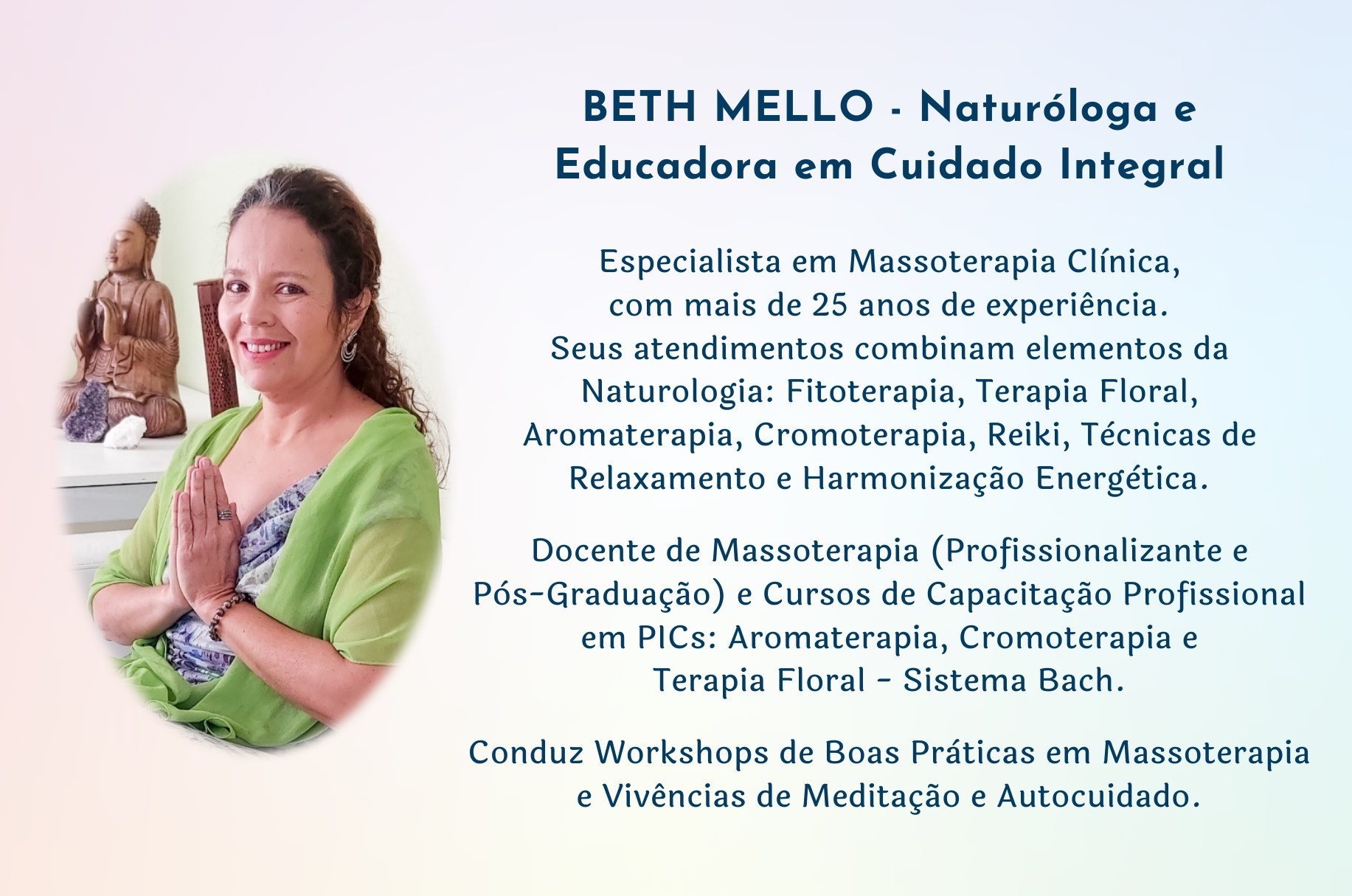 Naturóloga e Massoterapeuta há 20 anos. Além da vasta experiência com atendimentos clínicos, oferece cursos de Massagens Terapêuticas, Aromaterapia, Cromoterapia, Técnicas de Relaxamento e Terapia Floral. É instrutora de Shantala - Massagem para Bebês e de Meditação..