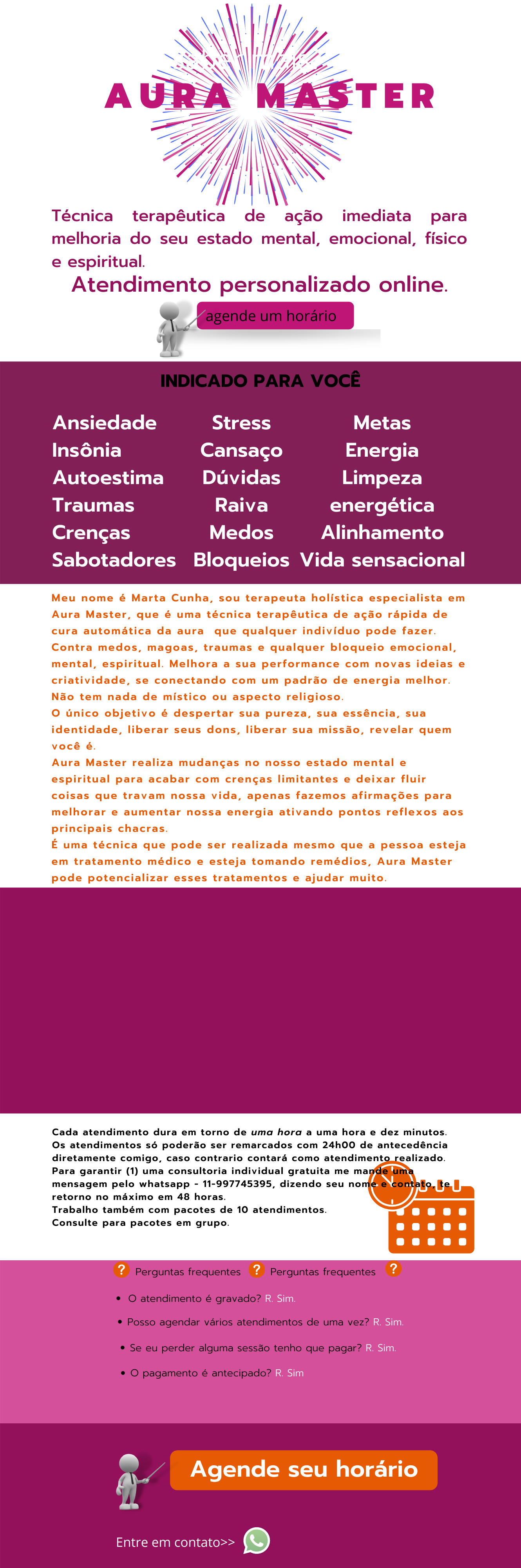 Oi! Meu nome é Marta, criei o MÉTODO ACOLHIMENTO para mulheres que procuram alívio imediato nas sensações de: esgotamento físico, mental e energético, cansaço, falta de foco, baixa autoestima, desânimo, tristeza, depressão, pressão no trabalho ou familiar. Te ajudo a reencontrar a sua essência. Trabalho a sua dor específica com indicações exclusivas para você.