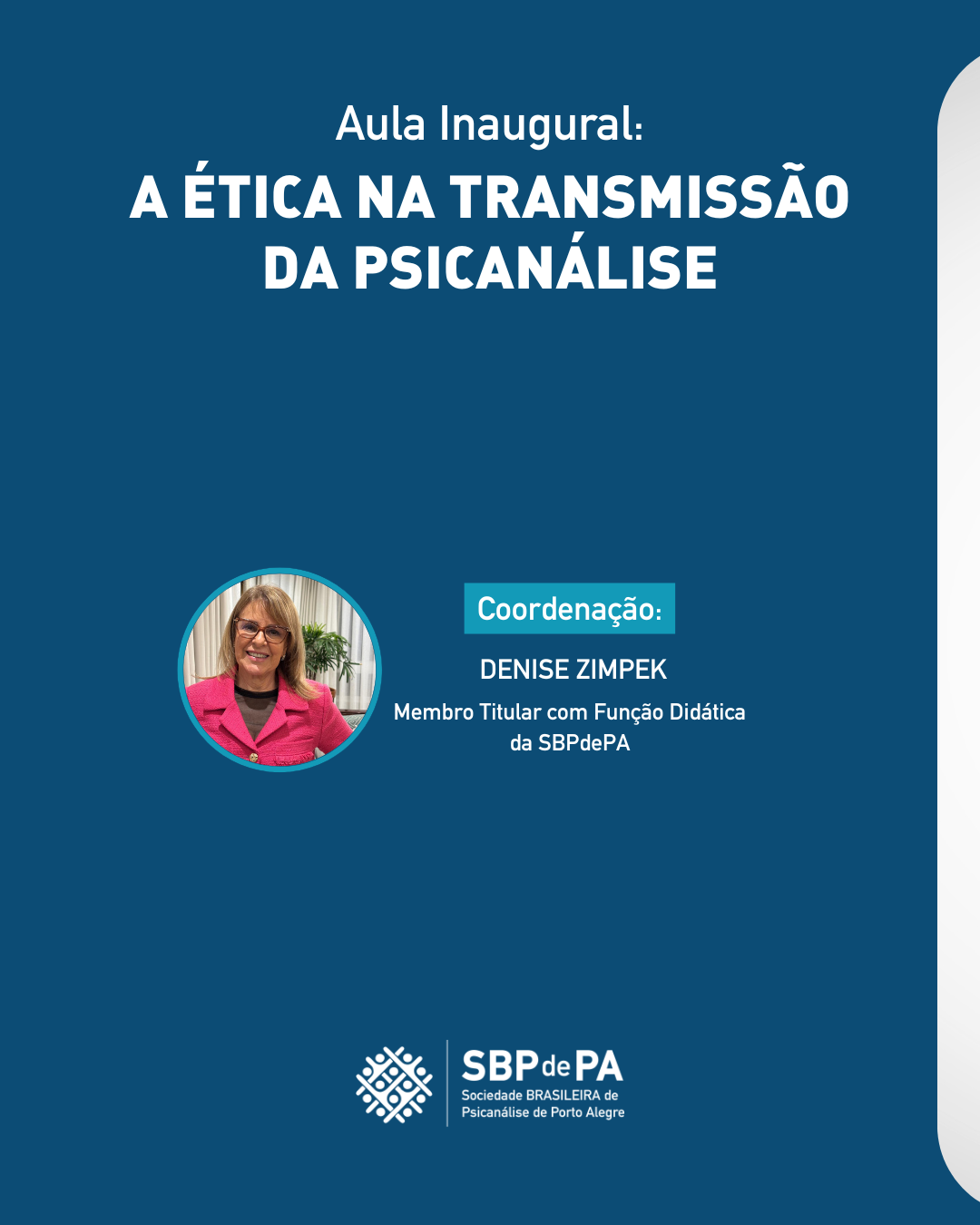 No dia 14 de março de 2026, das 9h às 10h15, a Sociedade Brasileira de Psicanálise de Porto Alegre realiza a atividade científica inaugural “A Ética na transmissão da Psicanálise”, em formato on-line, sob coordenação de Denise Zimpek, Membro Titular com Função Didática da SBPdePA.