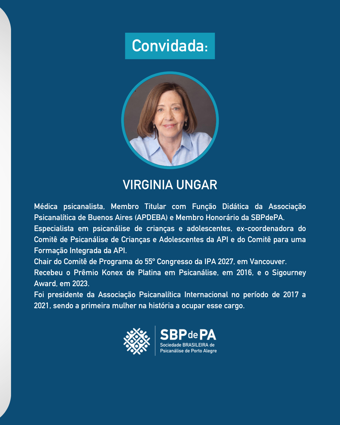 A programação contará com a participação de Virginia Ungar, médica psicanalista, Membro Titular com Função Didática da Associação Psicanalítica de Buenos Aires (APDEBA) e Membro Honorário da SBPdePA.