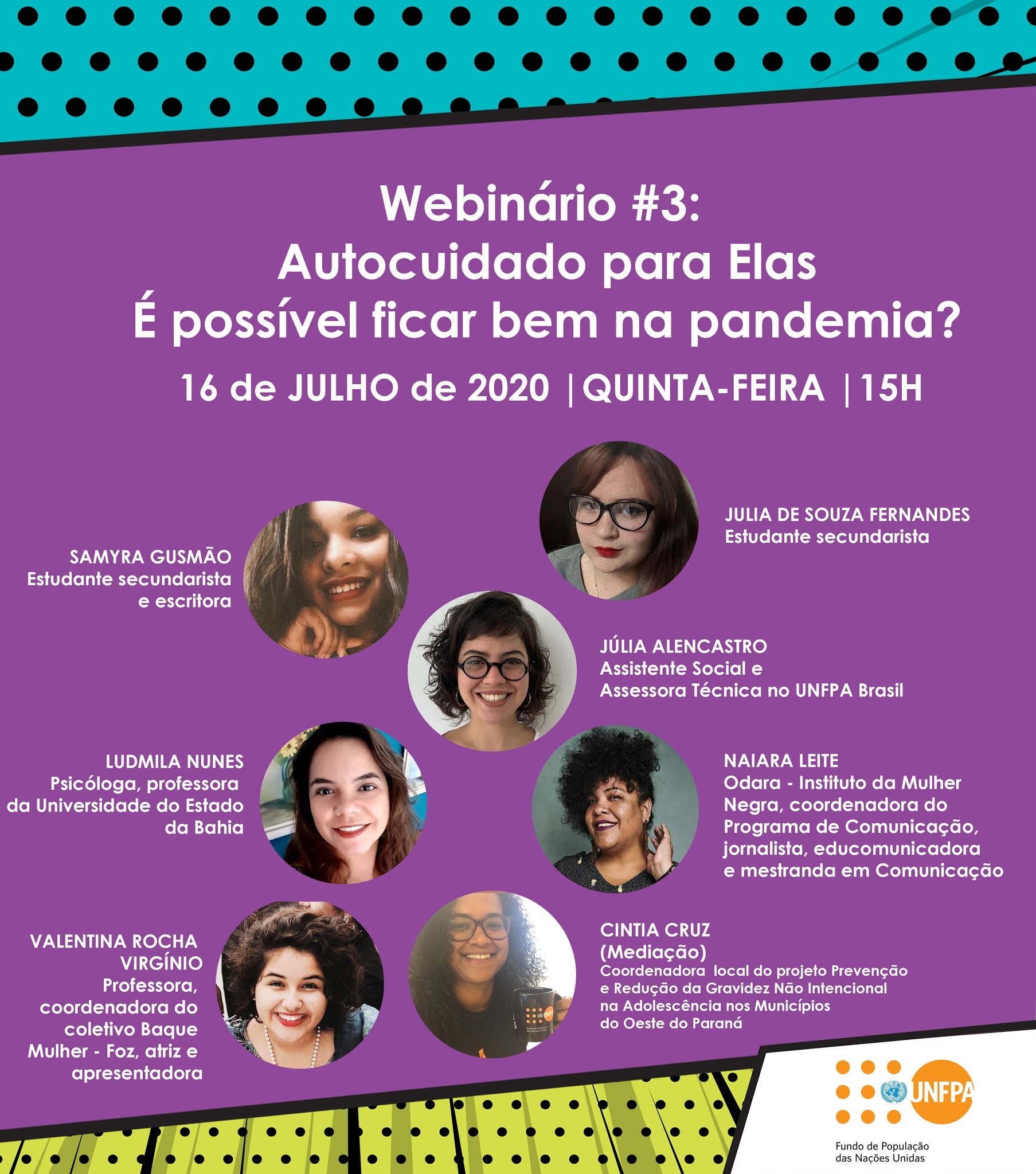 Manter relações saudáveis com emoções e a mente, e criar mecanismos de autocuidado são fundamentais para esse momento. Diante disso, o Fundo de População da ONU (UNFPA) realiza o webinário Autocuidado para Elas com objetivo de promover um espaço de discussão para criar estratégias de enfrentamento dessas situações. O encontro virtual, no formato de roda de conversa, busca também discutir os papéis de gênero dentro de casa, e questões relativas à saúde sexual e reprodutiva.