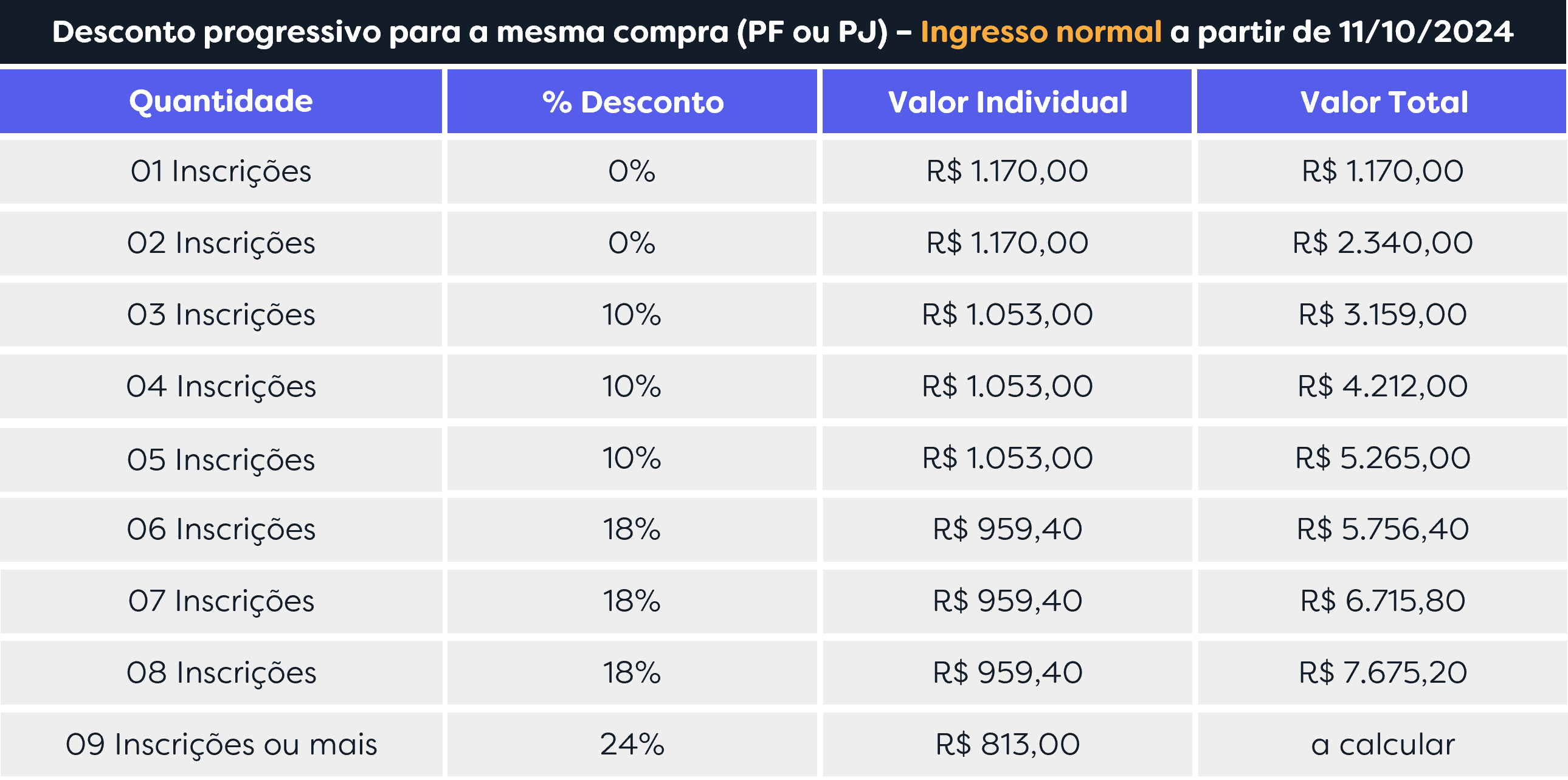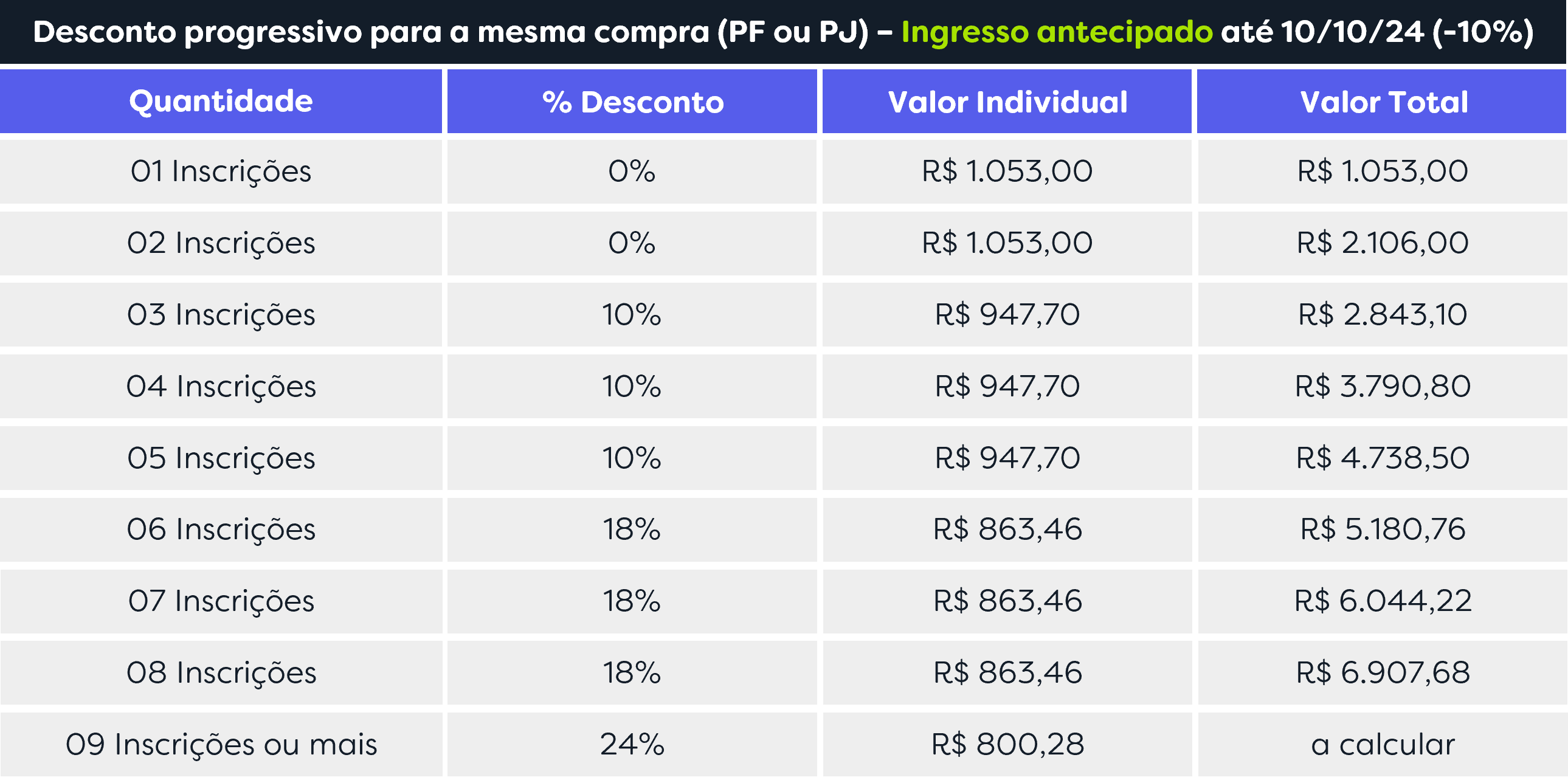 Para grupos, contratados pelo mesmo CPF ou CNPJ, entre em contato para realizar as suas inscrições. Confira a seguir a tabela de grupo.