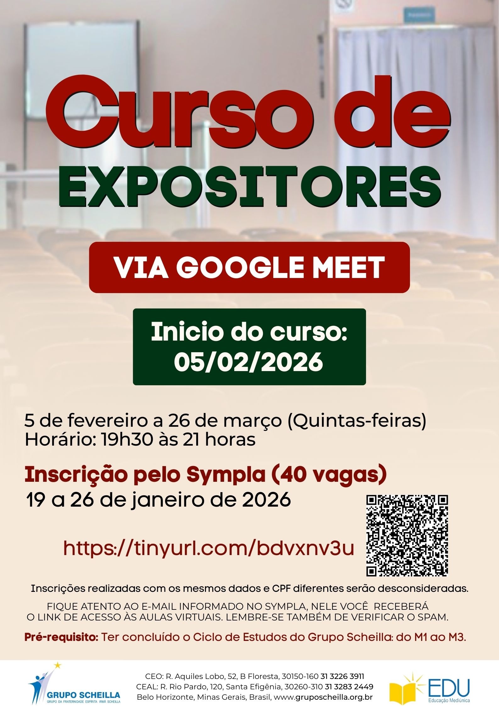 Solicitamos aos interessados que se inscrevam apenas se tiverem a certeza de que poderão estar presentes no curso, visando oportunizar a participação de todos.