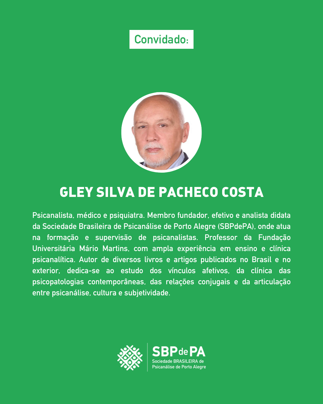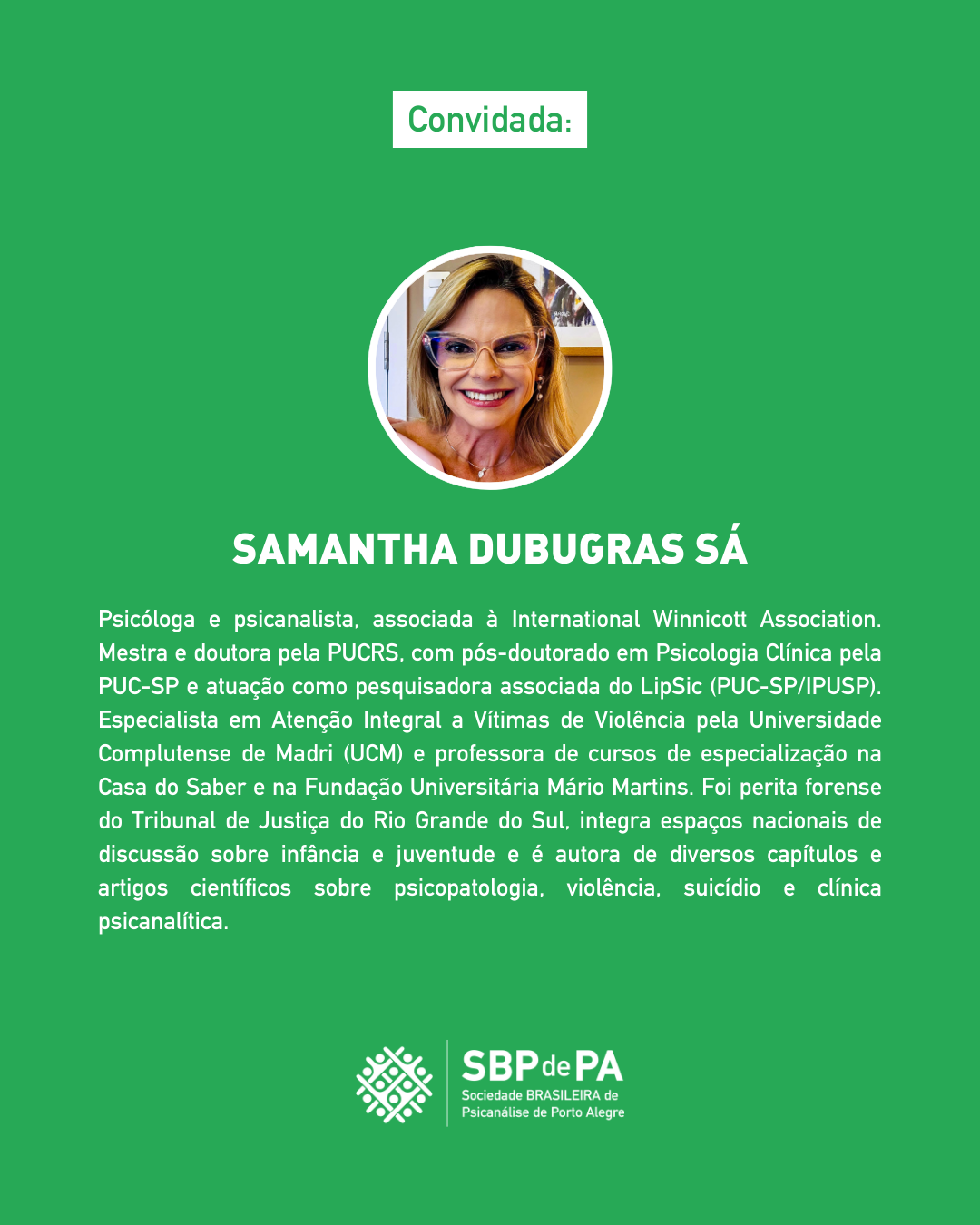Participam da programação Samantha Dubugras Sá e Gley Silva de Pacheco Costa, cujas contribuições ampliam o debate teórico-clínico a partir de suas experiências na psicanálise.