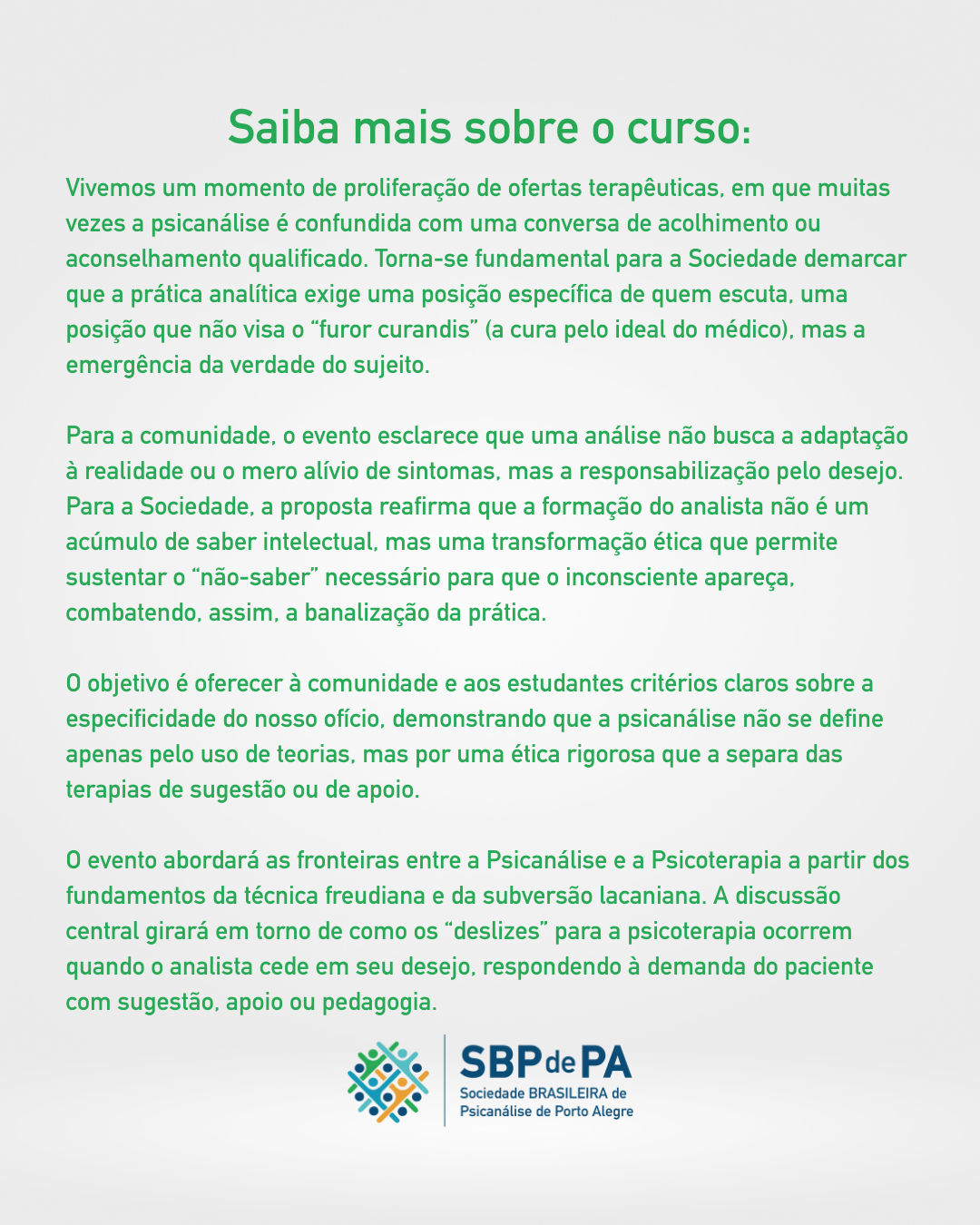 Em um cenário marcado pela multiplicação de ofertas terapêuticas, o evento propõe esclarecer a especificidade da prática psicanalítica, frequentemente confundida com abordagens de acolhimento ou aconselhamento. A psicanálise exige uma posição singular de escuta, orientada não pela busca de cura idealizada, mas pela emergência da verdade do sujeito.