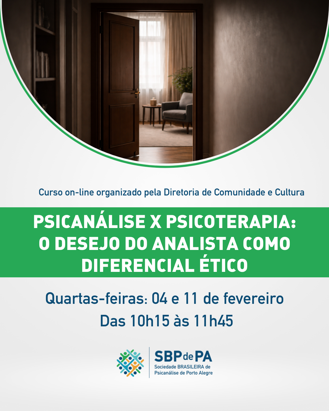 s dias 4 e 11 de fevereiro, das 10h15 às 11h45, a Sociedade Brasileira de Psicanálise de Porto Alegre realiza a atividade científica “Psicanálise x Psicoterapia: O Desejo do Analista como Diferencial Ético”, em formato on-line. A atividade integra a programação da instituição por meio da Diretoria de Comunidade e Cultura, sob coordenação de Susana Salete R. Chinazzo.