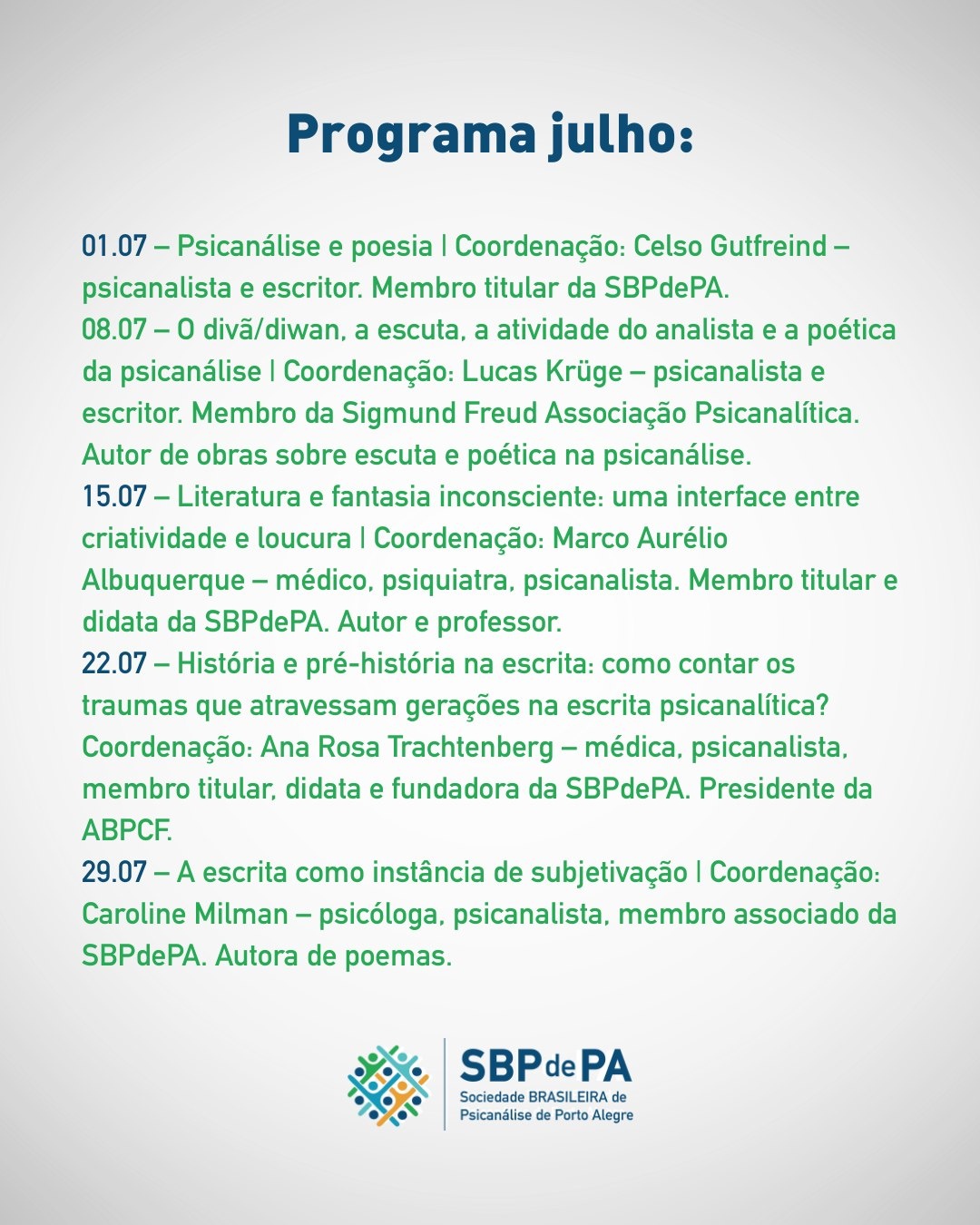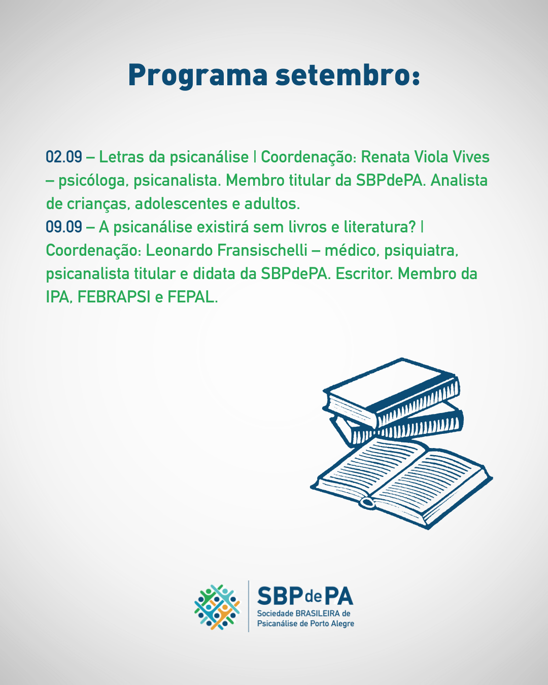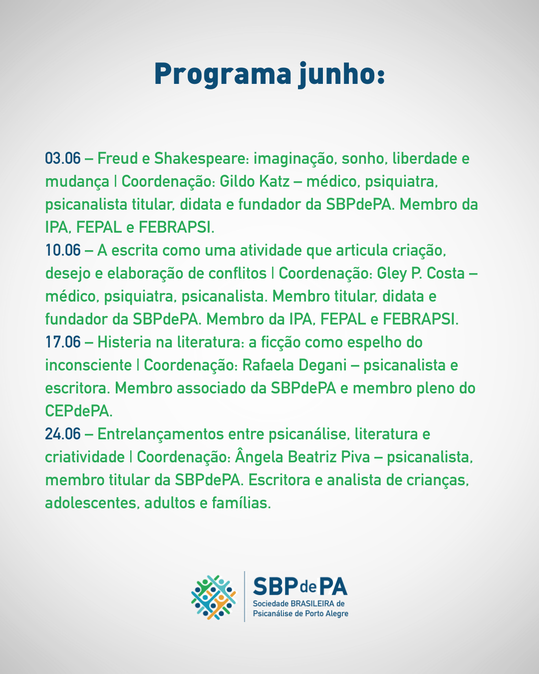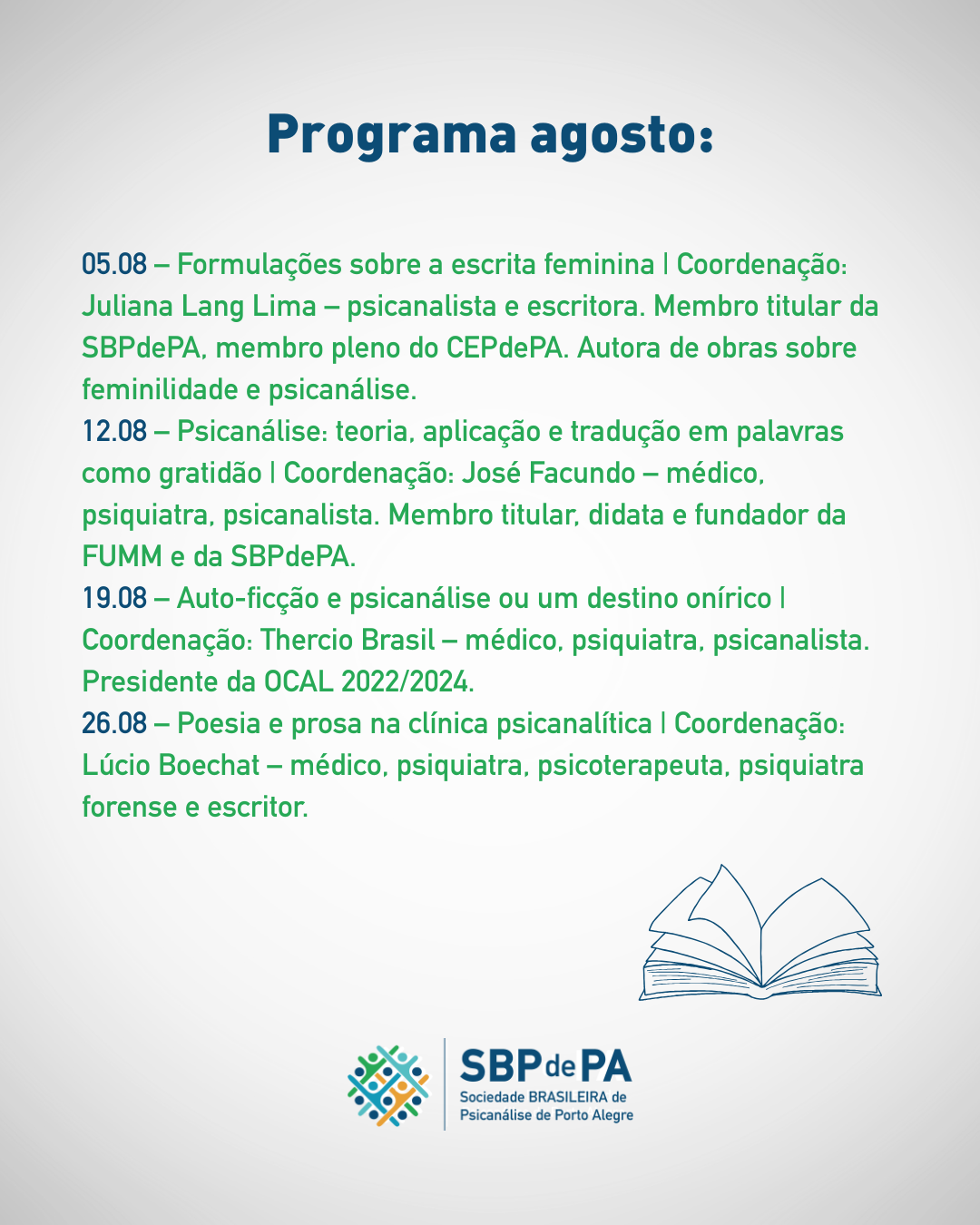 Com participação de membros da SBPdePA e de outras instituições, os encontros abordarão temas que atravessam a psicanálise e a literatura, explorando suas interfaces com a criação, o desejo, os conflitos, a escuta, a subjetividade e a linguagem.