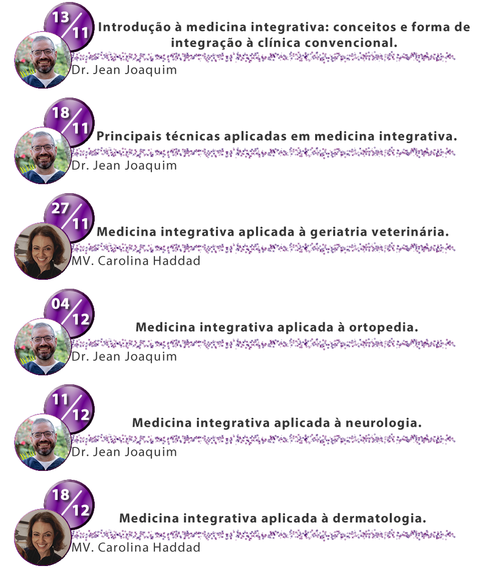 Este curso tem como objetivo capacitar o médico veterinário a utilizar ferramentas integrativas como acupuntura, fitoterapia chinesa e ocidental, dietoterapia funcional, ozonioterapia, terapia neural, campo magnético e laserterapia, de forma ética, segura e embasada cientificamente. A proposta é oferecer conhecimentos aplicáveis na rotina da clínica de pequenos animais, com foco em diferentes especialidades: