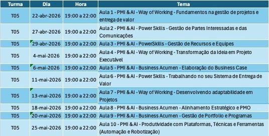 Utilizamos em todos os 10 encontros a Inteligência Artificial, pautados nas principais áreas do Gerenciamento de Portfólio, Programas, Business Requeriments, Projetos com PMBOK 8ed (Novo), Guia de Processos e Guia Ágil. O curso é totalmente novo, moderno, pensado, elaborado e entregue para a comunidade de gestores, como resposta aos inúmeros desafios desta brilhante carreira.
