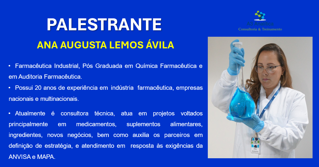 Palestrante: Ana Augusta Lemos Ávila. Graduada em Farmácia Industrial. Pós-graduada em Química Farmacêutica e em Auditoria Farmacêutica. Possui mais de 15 anos de vivência em indústrias farmacêuticas nacionais e multinacionais. Experiência em Laboratório Analítico e Documentação técnica, atualmente é consultora técnica na A3Analítica.