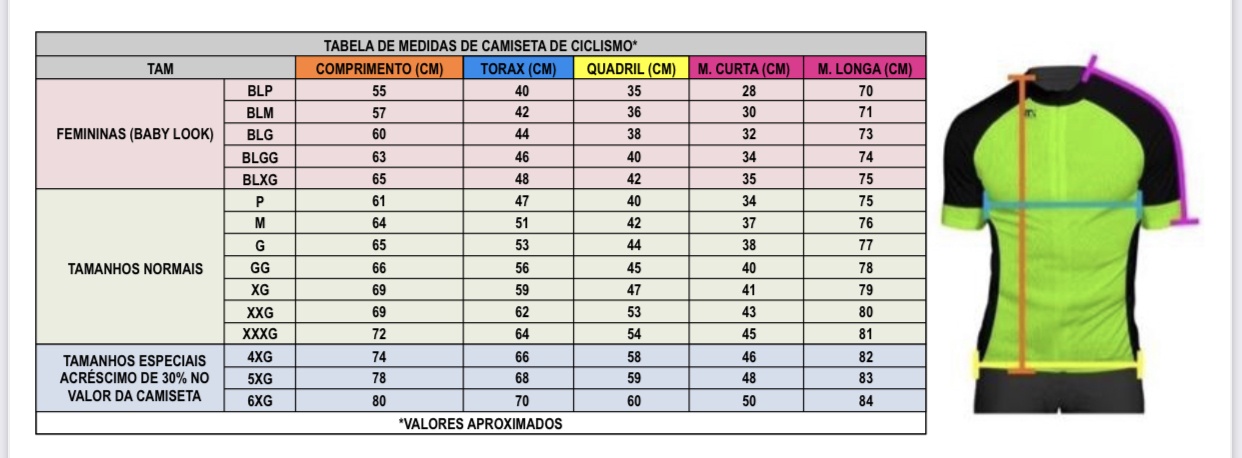 TABELA TAMANHO CAMISETA DE CICLISMO: