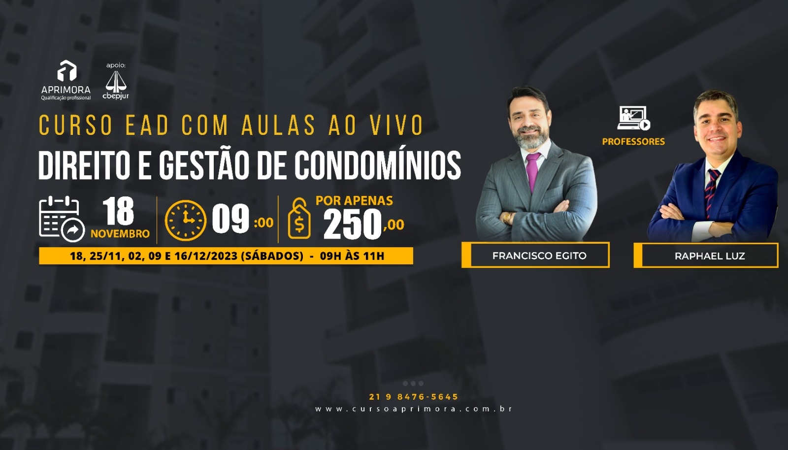 Prof. Francisco Egito, advogado especialista nas áreas imobiliária e condominial, administrador e contador. MBA em Negócios Imobiliários. Diretor do Curso Aprimora e CBEPJur;