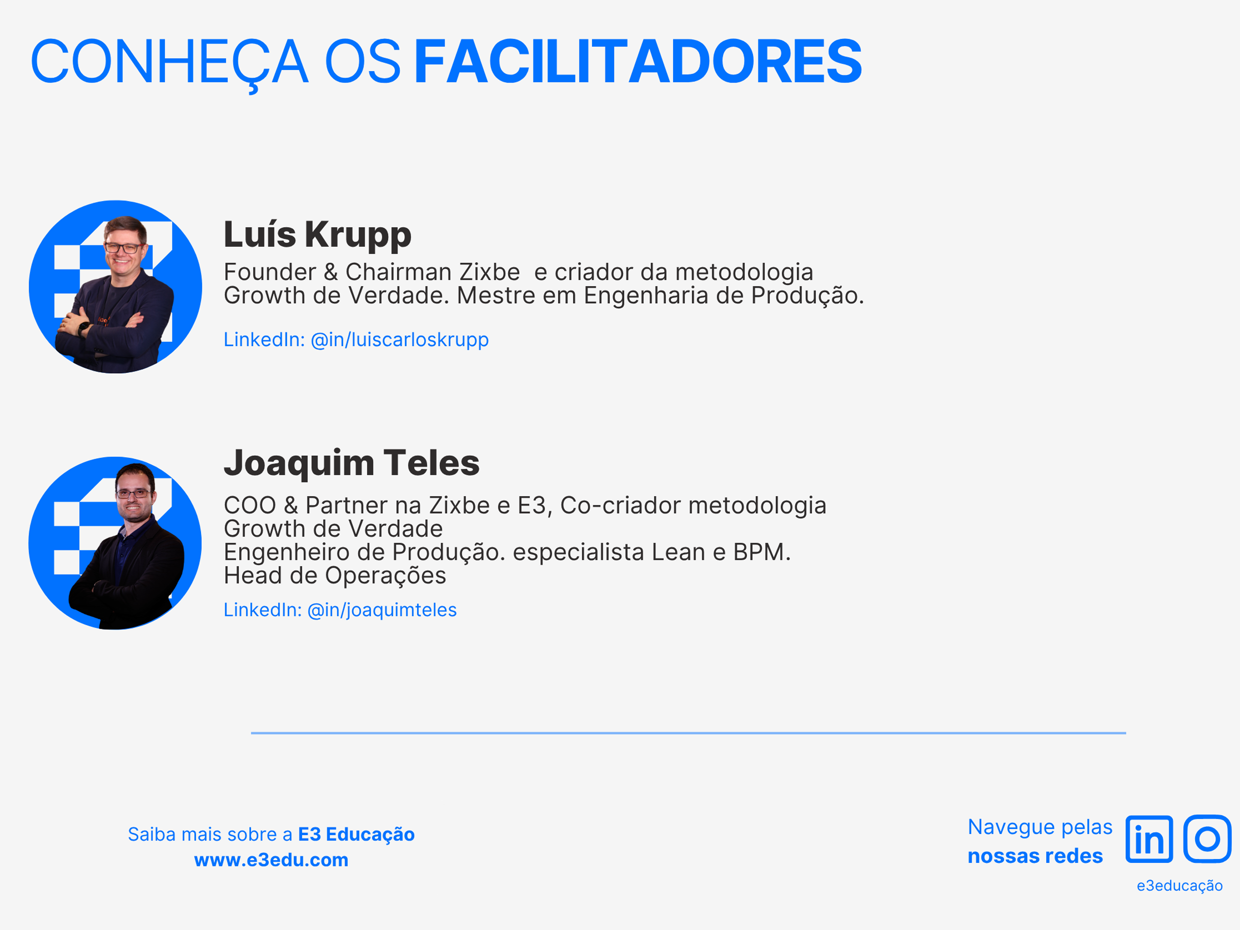 E3 Educação é a empresa do Ecossistema Growth responsável por um dos ativos mais estratégicos da jornada de transformação: As pessoas. Nosso propósito é capacitar profissionais para que possam impulsionar experiências incríveis e resultados excepcionais, em alinhamento com a metodologia Growth de Verdade.
