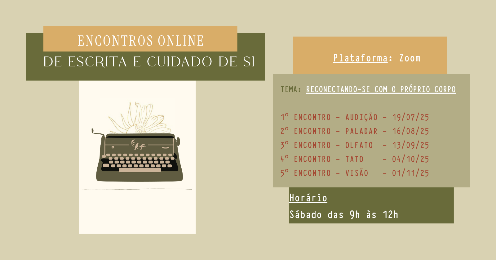 Os encontros serão um espaço seguro e facilitador para te ajudar a se (re)conectar com seu corpo por meio da escrita. Serão ofertadas: