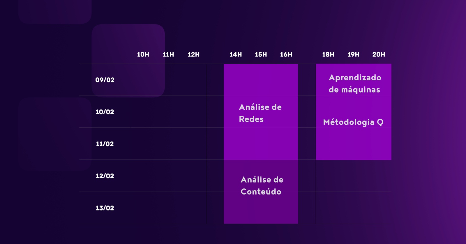 Este curso apresenta princípios teóricos e métodos empíricos relacionados à utilização de análise de redes complexas para análise de plataformas de redes sociais online, particularmente voltada para o combate a campanhas de desinformação. Entre os principais tópicos, estão segmentação algorítmica e segmentação voluntária; métodos de agrupamento e análise crítica de resultados algorítmicos; definição de centralidade de rede e mutações temporais em redes complexas; problemas para identificação de bots; e análise de redes em aplicativos de mensageria sem algoritmos de visibilidade. No curso adotamos uma abordagem de métodos mistos baseada em softwares livres e em linguagem de programação R, e combinando análise de rede, análise de texto e análise de imagens.