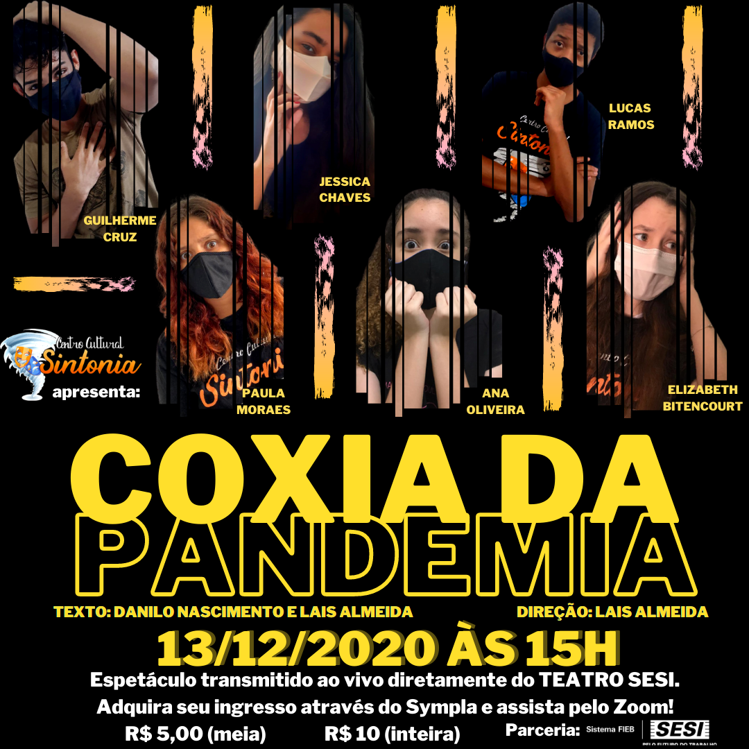TOTALMENTE INESPERADO E APRESENTANDO OS BASTIDORES DE UM ESPETÁCULO TEATRAL, A PEÇA "COXIA DA PANDEMIA" CONTA A HISTÓRIA DE UM GRUPO DE TEATRO NO MOMENTO EM QUE ESTÃO APRESENTANDO UM ESPETÁCULO EM PLENA PANDEMIA. DIVERTIDA E AO MESMO TEMPO REFLEXIVA, A APRESENTAÇÃO É UMA MOSTRA DOS ALUNOS DO CURSO DE TEATRO DO CENTRO CULTURAL SINTONIA. COM DIREÇÃO DE LAIS ALMEIDA E TEXTO DE DANILO NASCIMENTO E LAIS ALMEIDA, O ESPETÁCULO PRETENDE MOSTRAR AQUILO QUE AS PESSOAS NÃO CONSEGUEM VER QUANDO UMA PEÇA ESTÁ ACONTECENDO, TODA CORRERIA, AGONIA E DESESPERO. TUDO QUE OS ALUNOS RELATAM PARA SEUS AMIGOS E FAMILIARES SERÁ MOSTRADO EM UMA PEÇA MUITO ENGRAÇADA, COM PERSONAGENS QUE GUARDAM SEGREDOS E COM UMA PEQUENA HOMENAGEM A TODOS OS TRABALHADORES DA ÁREA QUE ESTÃO SOFRENDO COM A PANDEMIA.