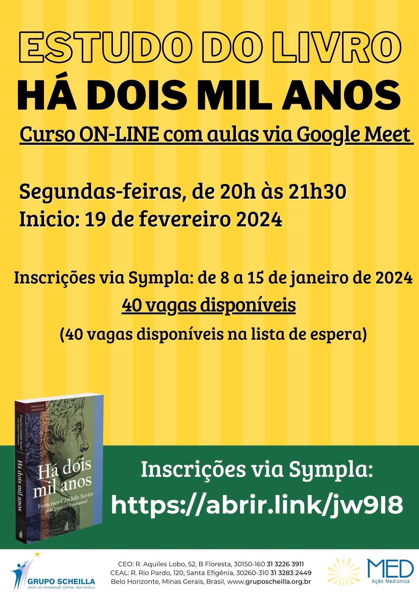 As aulas do Estudo do livro "Há Dois Mil Anos" acontecem no formato virtual, via Meet, às segundas-feiras, das 20h às 21:30.