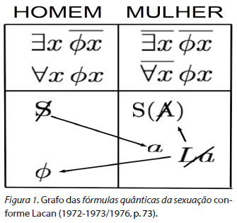 Como os homens se relacionam? E as mulheres? Seria possível pensar uma especificidade do masculino e outra do feminino no que se refere ao amor, ao sexo e ao gozo? Mais ainda, seria o homem masculino e a mulher feminina? E quanto aos relacionamentos homoafetivos, estariam pautados em outra lógica que não uma heterossexual? Em que seriam semelhantes? É pra dar conta destas questões que proponho o presente estudo, que tem por objetivo investigar a construção das fórmulas da sexuação (desenvolvidas sobretudo ao longo dos seminários 18, 19, 20 e 21 de Lacan). Por meio da tabela da sexuação (figura abaixo) Lacan postula uma série de posições assumidas pelos seres falantes no campo do amor e do sexo.