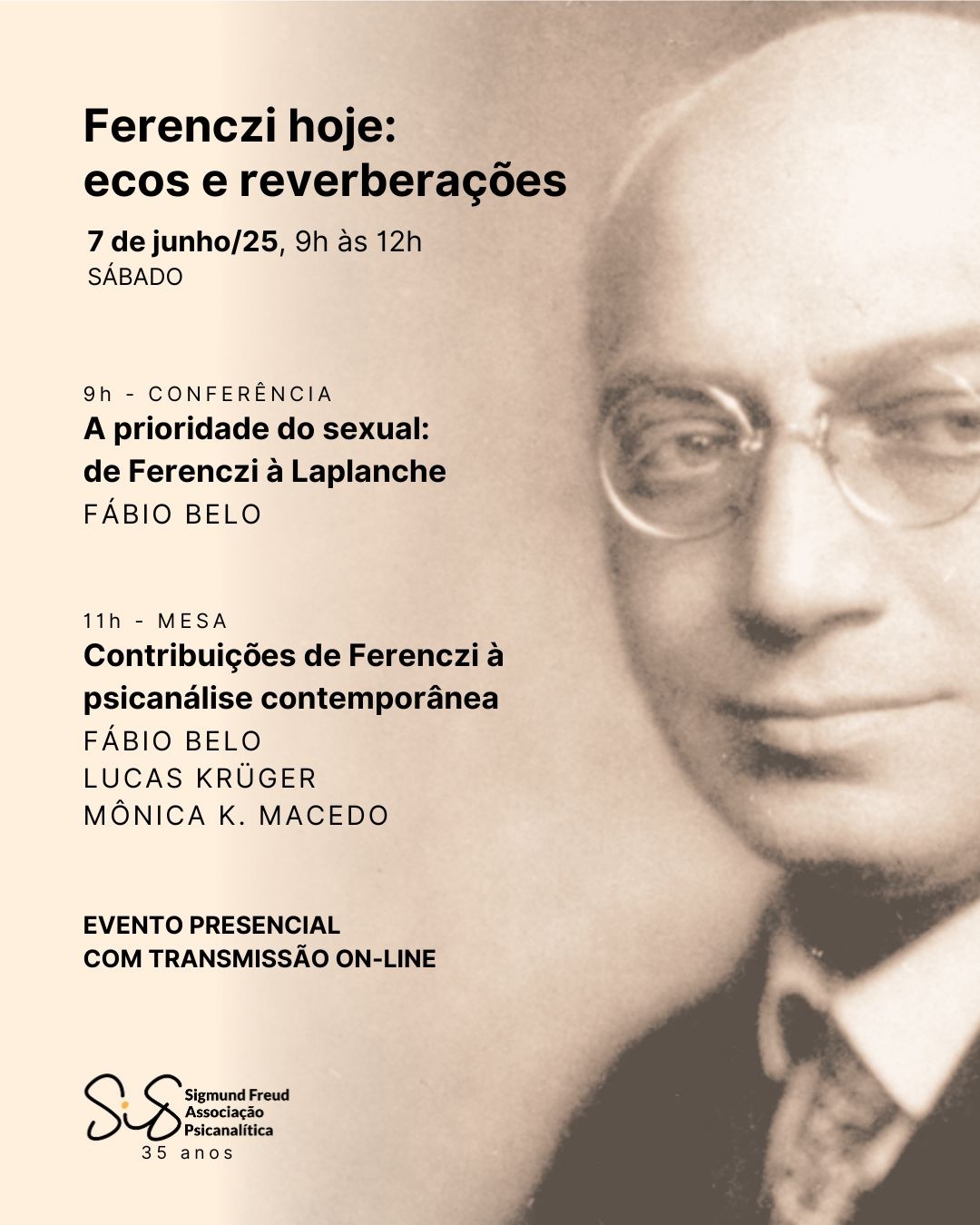 A Sigmund Freud Associação Psicanalítica é uma instituição de Psicanálise, comprometida com a formação de psicanalistas e a produção de conhecimento no diálogo com outros saberes. Oferece diferentes modalidades de participação: clínica de atendimento psicanalítico, produção e publicações científicas, intervenções sociais, estágios em Psicologia, investigação em Psicanálise e parcerias institucionais. Novo endereço: Rua Dr. Timóteo, 752, Moinhos de Vento, Porto Alegre sig.org.br / [email protected]