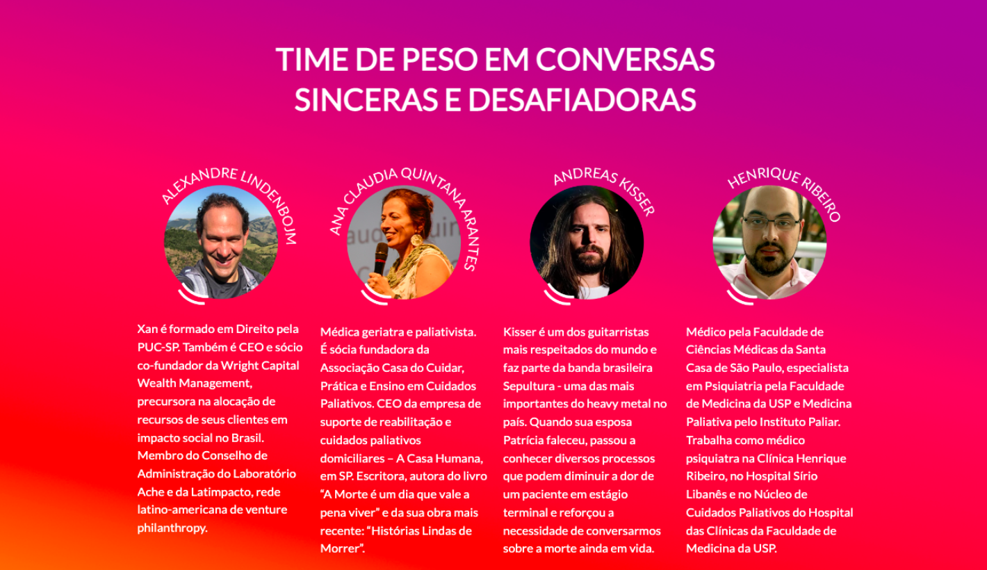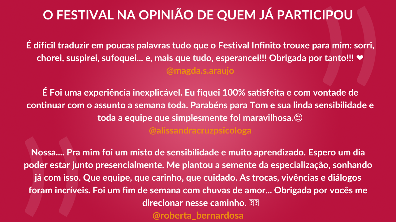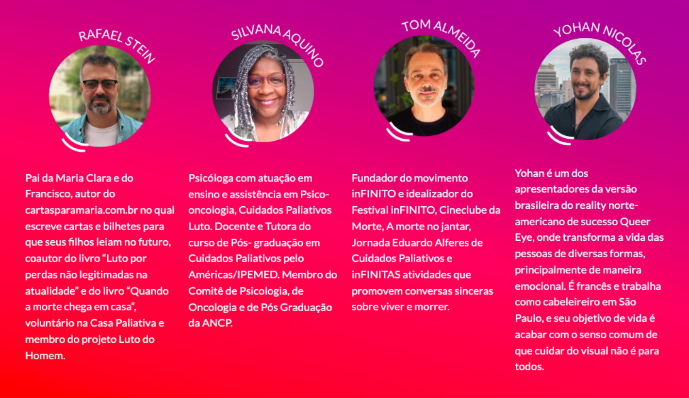 Um movimento de discussões sobre o viver e o morrer. O criador, Tom Almeida, originalmente profissional do marketing e que, a partir de perdas pessoais, vem se dedicando a estudos sobre envelhecimento, cuidados paliativos, terminalidade, morte e luto. Entre as atividades do inFINITO, estão o A Morte no Jantar, o Cineclube da Morte, Death Over Drinks, Guia de Rituais Virtuais de Despedida, diversas lives e palestras. O inFINITO acredita que com consciência da finitude é que podemos viver melhor.