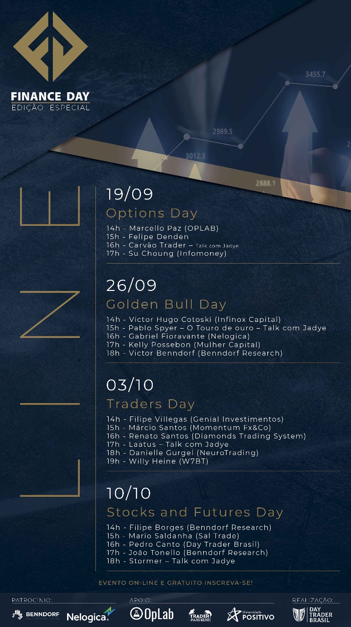 Sobre o evento: O Finance Day Edição especial é um evento inovador, onde os participantes terão a oportunidade de estar perto de grandes profissionais do mercado financeiro, sendo eles gestores, grandes investidores, operadores institucionais, economistas renomados e muito mais!
