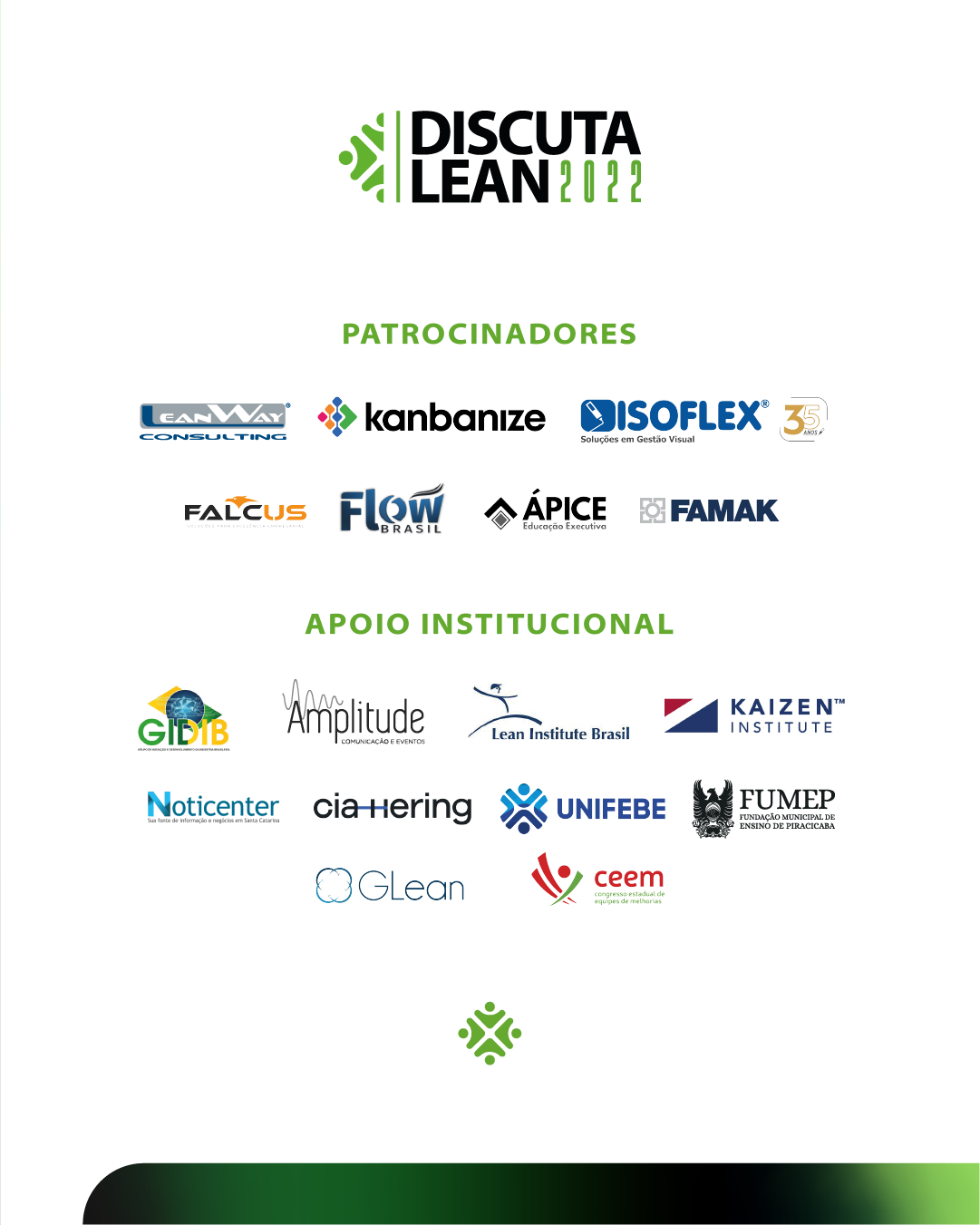 Discuta Lean, é uma organização sem fins lucrativos, que visa compartilhar boas práticas a fim de auxiliar nas organizações em seu processo de Melhoria Contínua Nosso site: www.discutalean.org Email de Contato: [email protected] Bom evento