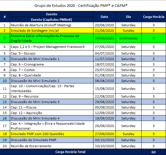 OBS: Este Grupo de Estudos atenderá ao requisito das horas de educação em gerenciamento de projetos exigido como um dos requisitos para obtenção da certificação PMP e CAPM.