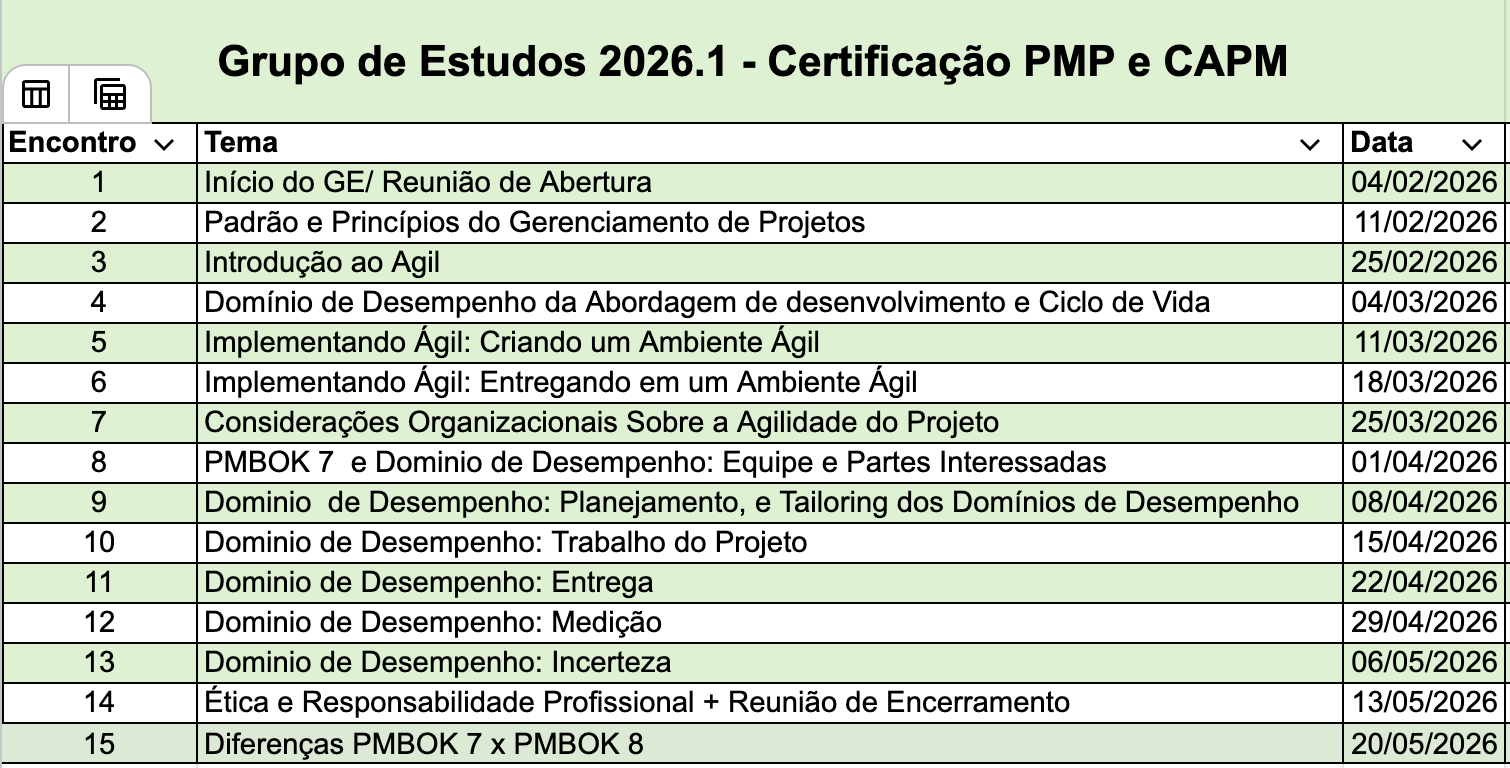 Esta nova turma será realizada totalmente ONLINE, através do Sympla Streaming. Grupo de estudo focado no PMBOK 7ª edição, ideal para quem pretende realizar a certificação antes da atualização da prova para o PMBOK 8, que deve ocorrer entre Julho e Agosto/26.