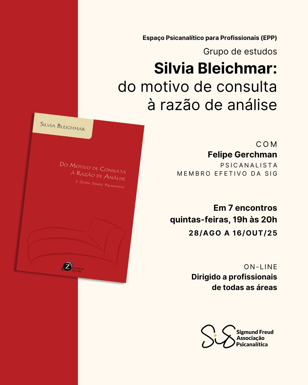 A Sigmund Freud Associação Psicanalítica é uma instituição de Psicanálise, comprometida com a formação de psicanalistas e a produção de conhecimento no diálogo com outros saberes. Oferece diferentes modalidades de participação: clínica de atendimento psicanalítico, produção e publicações científicas, intervenções sociais, estágios em Psicologia, investigação em Psicanálise e parcerias institucionais. Endereço: Rua Dr. Timóteo, 752, Moinhos de Vento, Porto Alegre - sig.org.br - [email protected]