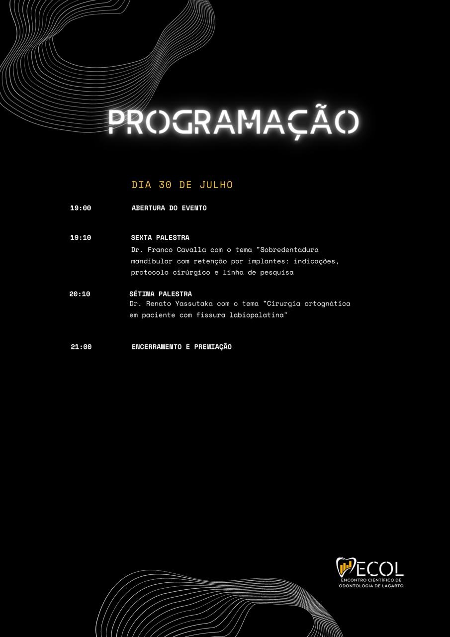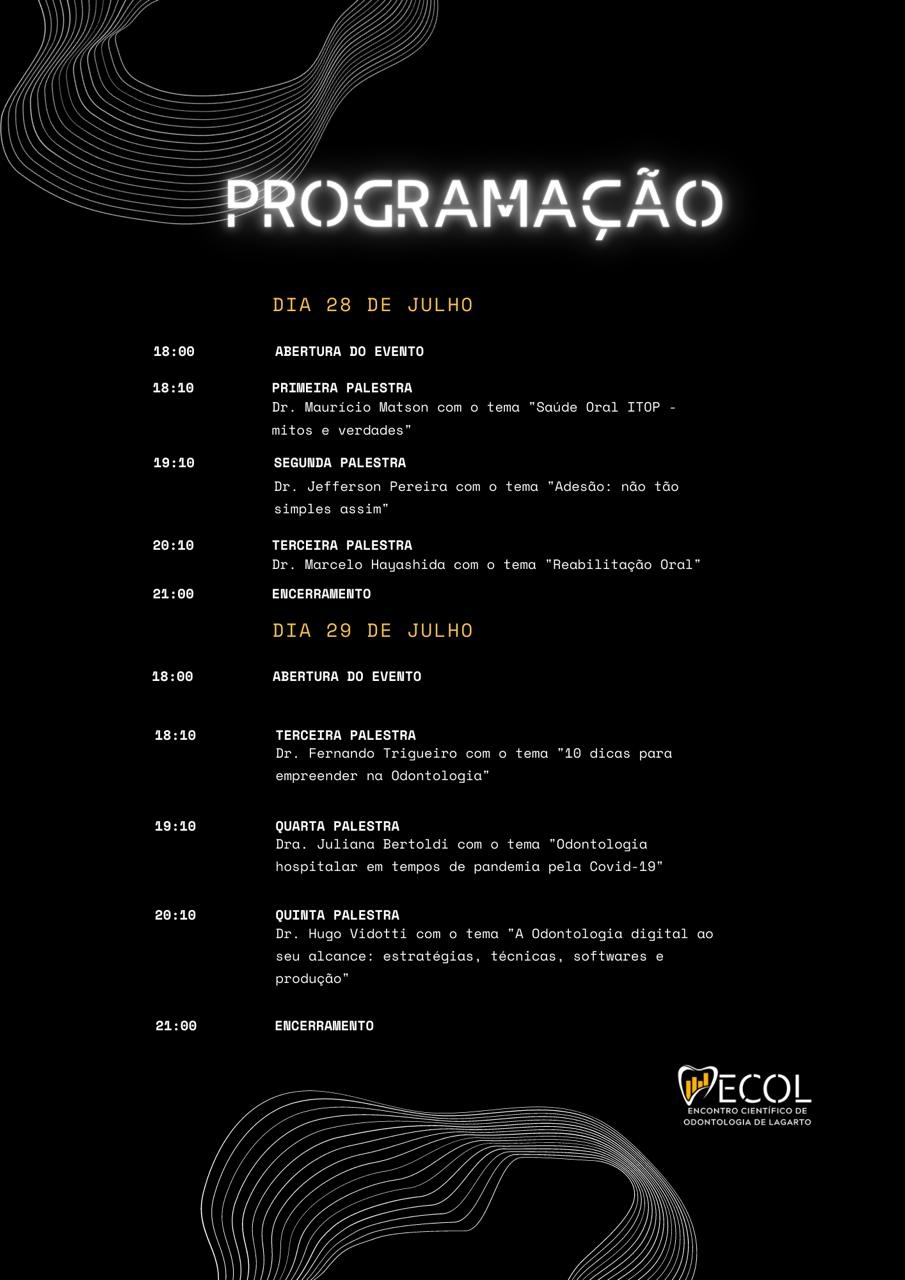 O III Encontro Científico de Odontologia de Lagarto (ECOL) realizado nos dias 28, 29 e 30 de julho de 2021, é um evento interdisciplinar voltado para graduandos de odontologia e cirurgiões-dentistas (CD) com o intuito de atualiza-los sobre diversas áreas da odontologia por meio de uma visão clínica integrada a partir de palestras com nomes de referência no assunto. Além da criação de um espaço para exposição, apresentação, discussão e divulgação de trabalhos e pesquisas científicas e tecnológicas através de apresentações de trabalhos científicos.