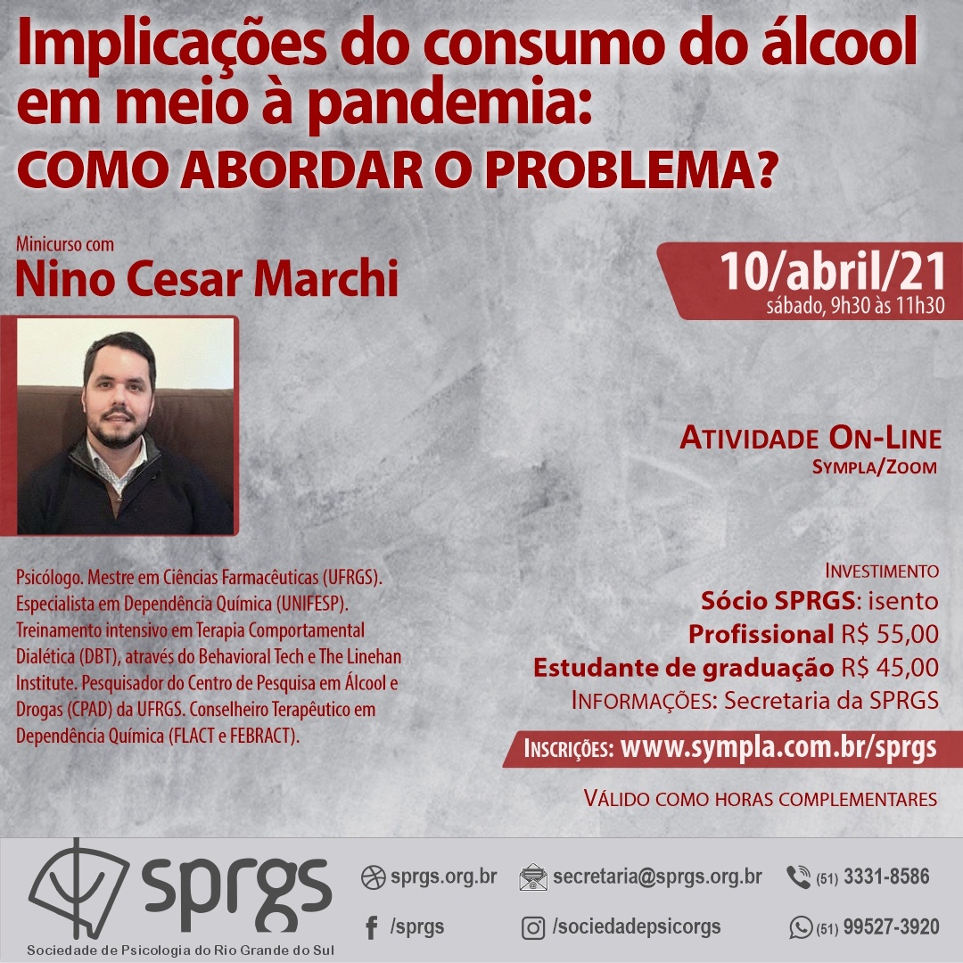 Nino Cesar Marchi: Psicólogo (PUCRS). Mestre em Ciências Farmacêuticas (UFRGS). Especialista em Dependência Química (UNIFESP). Treinamento intensivo em Terapia Comportamental Dialética (DBT), através do Behavioral Tech e The Linehan Institute. Atualmente é pesquisador do Centro de Pesquisa em Álcool e Drogas (CPAD) da UFRGS, no Hospital de Clínicas, unidade Álvaro Alvim. Tem experiência em Psicologia Clínica, Drogas de Abuso e problemas correlatos e atua como Psicólogo Clínico e Pesquisador com ênfase, atuando principalmente nos seguintes temas: cocaína/crack, álcool, tabaco, maconha e drogas sintéticas. Já trabalhou como assistente de pesquisa em projetos financiados pelos governos brasileiro e americano. Atualmente é Conselheiro Terapêutico em Dependência Química credenciado pela Federación Latinoamericana de Comunidades Terapéuticas (FLACT) e Federação Brasileira de Comunidades Terapêuticas (FEBRACT). Por diversos anos atuou voluntariamente na Cruz Vermelha, em Porto Alegre, desempenhando a função de Diretor do Setor de Educação para Saúde. Frequentemente apresenta palestras em empresas, escolas, ONGs e eventos juvenis, destinados a educadores e pais, sobre as temáticas: comunidades terapêuticas, adolescência, prevenção ao uso e abuso de substâncias psicoativas e o impacto das drogas de abuso.