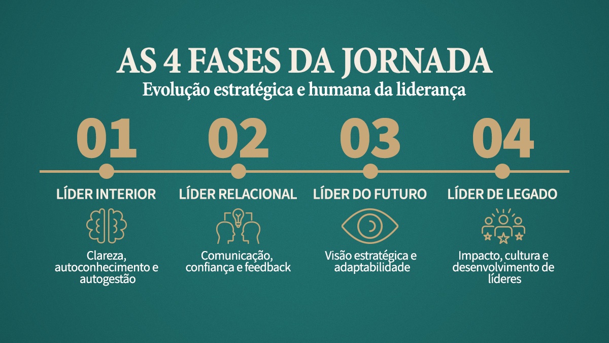 A Jornada da Liderança não é apenas um curso, é um programa de desenvolvimento estruturado em 4 fases fundamentais, onde unimos teoria robusta à prática imediata do ambiente corporativo.