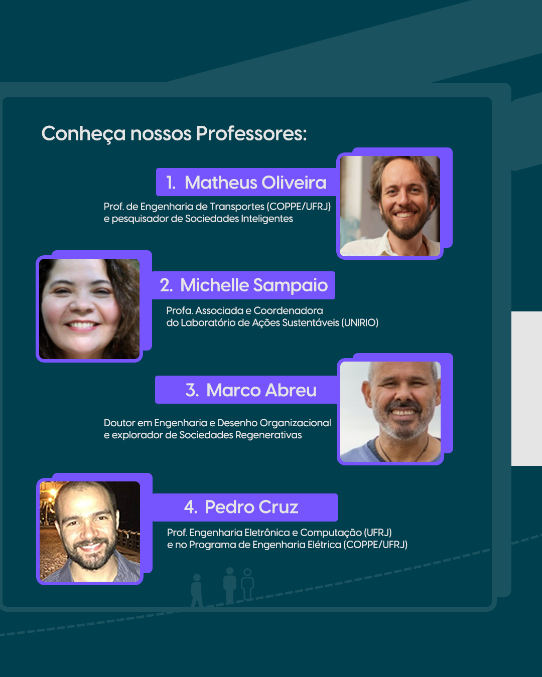 Disciplina 1: “Diagnóstico Centrado no Humano”. Disciplina 2: "Escuta ativa para diagnóstico e construção de visão para a transformação da mobilidade urbana”. Disciplina 3: “Da Cidade Inteligente à Cidade Regenerativa”. Disciplina 4: “Big Data, Sensores e Gêmeos Digitais para Diagnóstico Urbano”.