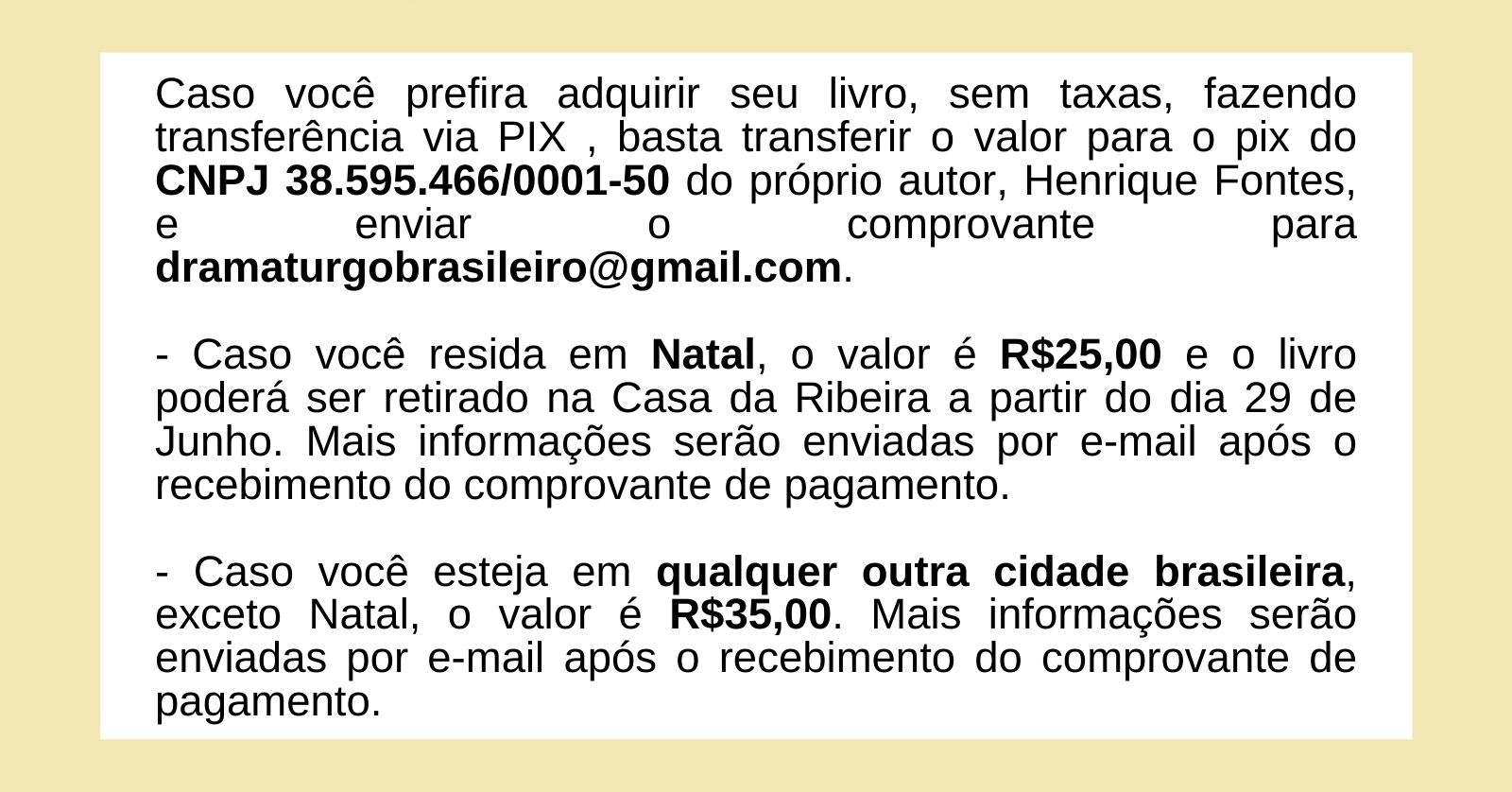 O lançamento virtual contará com leituras dramáticas de trechos das peças, feitas pelos atores Doc Câmara, Juracy Oliveira e Maurício Lima, seguido de um bate-papo com o dramaturgo Henrique Fontes, mediado pelo ator Mateus Cardoso. A publicação de “Dramaturgia do Desejo: 3 peças de amar” foi possível graças ao Prêmio Fernando Athayde de Dramaturgia, do edital No 09/2020 - da Fundação José Augusto, Governo do RN, através da Lei Aldir Blanc, Governo Federal.