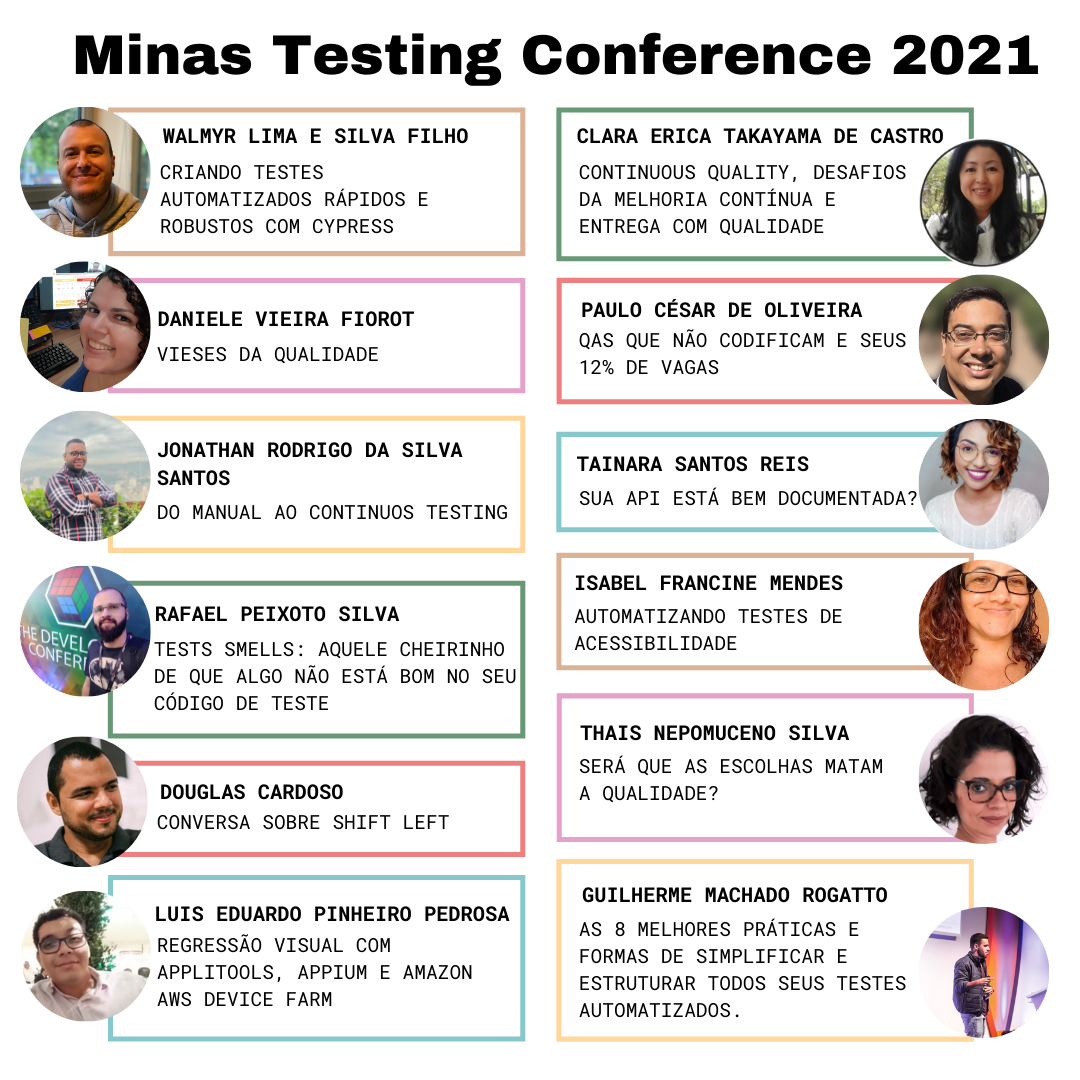 Minas Testing Conference é um evento com foco em qualidade de software criado em 2015 e realizado anualmente em Belo Horizonte - Minas Gerais. Sempre com temas em destaque no mercado brasileiro e internacional, o MTC proporciona o compartilhamento de conhecimentos e experiências incríveis, além de promover networking, elevando a qualidade dos profissionais participantes. Atualmente o evento está sendo realizado Online e Gratuito.