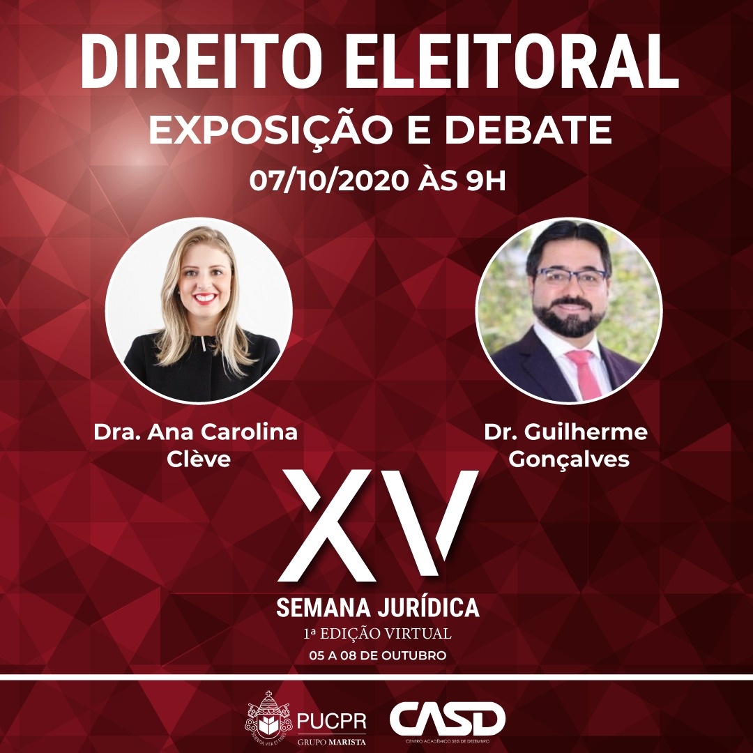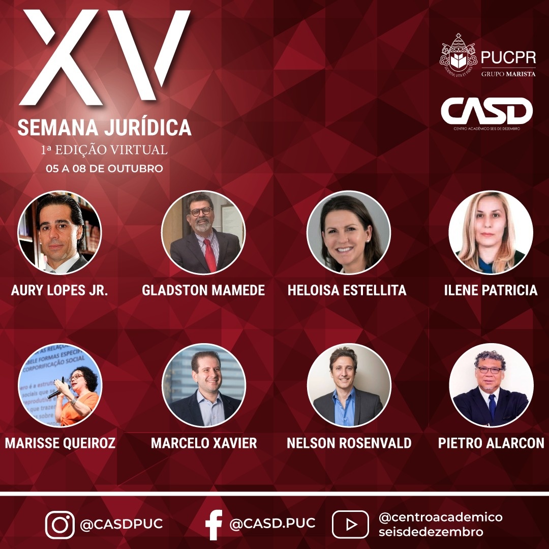 O Centro Acadêmico Seis de Dezembro (CASD - PUCPR) tem a honra de convidar toda a comunidade acadêmica de Londrina e região para participar da sua tradicional Semana Jurídica, neste ano em sua 1ª Edição Virtual, que ocorrerá entre os dias 05 a 08 de outubro pela plataforma do Youtube no link http://bit.ly/XVSJ_CASD.