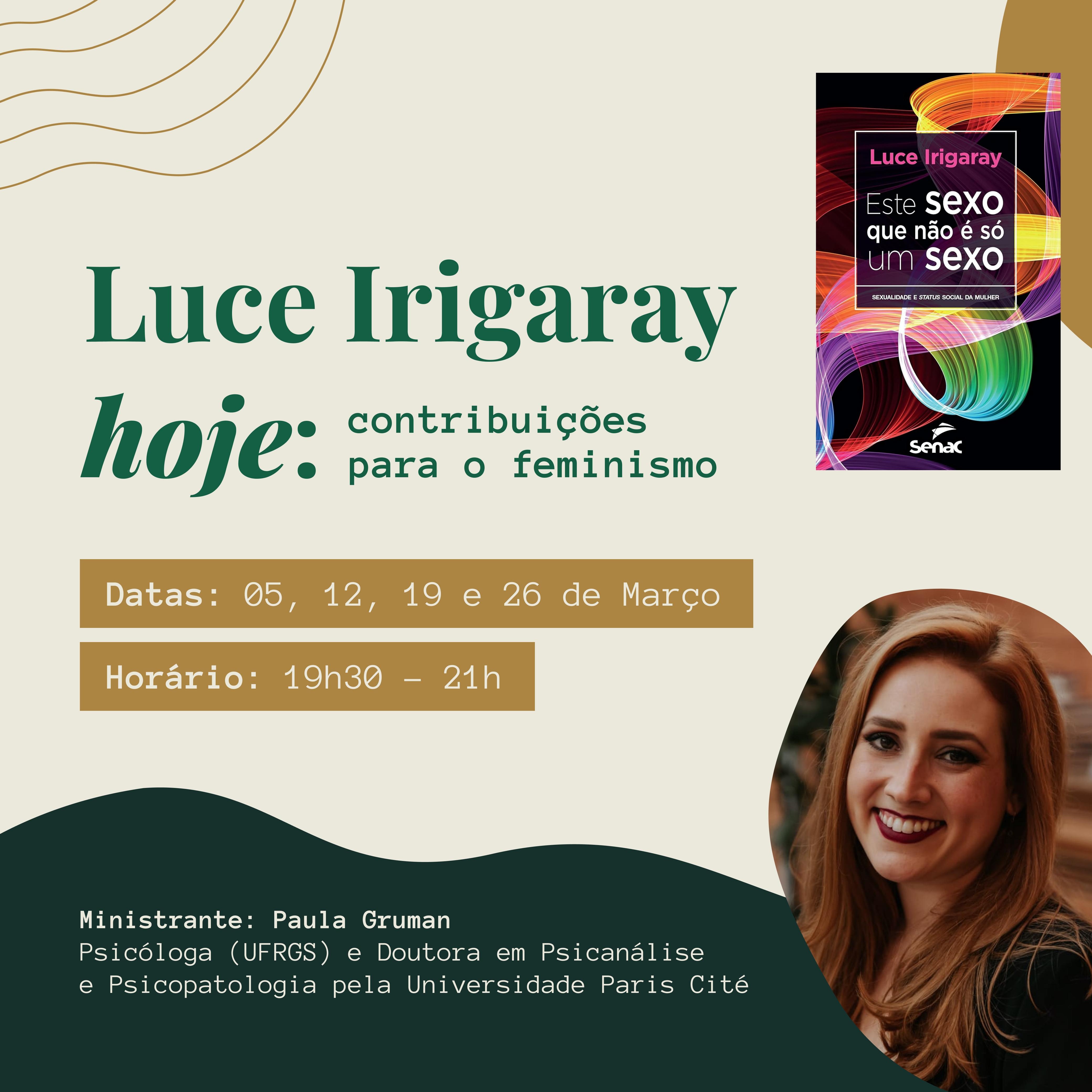 Esse curso de quatro encontros apresenta alguns conceitos centrais do feminismo de Luce Irigaray, buscando estabelecer pontes entre suas ideias principais e as discussões feministas da atualidade. O objetivo é apresentar conceitos da teoria de Irigaray que podem contribuir para o feminismo hoje, além de permitir um aprofundamento na própria obra de Luce Irigaray.